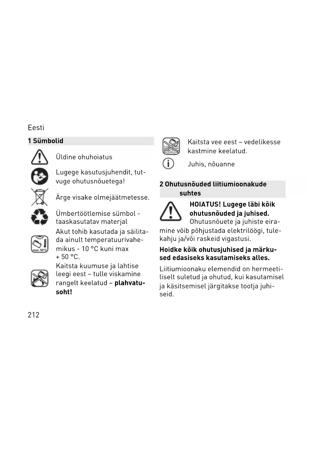 käsitsemiseks Tarnimisel on aku osaliselt lae tud. Aku täieliku mahtuvuse ta Eesti 216gamiseks laadige aku enne es makordset kasutamist täiesti täis. Akut võib igal ajal laadida, ilma et selle kasutusiga lüheneks. Laadimise kat kestamine ei kahjusta akut. Pärast elektrilise tööriista automaatset väljalülitumist ärge vajutage enam lülitile (sisse/välja). Aku võib kahjustada saa da. Aku on varustatud temperatuurikon trolliga, mis lubab akut laadida ainult temperatuuril 0 °C kuni 55 °C. See pi kendab aku kasutusiga. – Hoidke akut võimalikult jahedas (5 °C kuni 25 °C) ja kuivas (õhuniiskus < 80%) kohas. – Ärge jätke akut näiteks suvel autosse seisma. – Aku oluliselt lühenenud tööaeg näitab, et aku kasutusressurss on ammendu nud ja aku tuleb välja vahetada. – Järgige soovitusi käitlemise kohta.