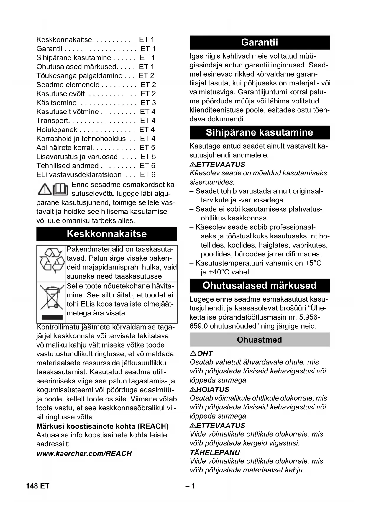 Chairman of the Board of Management Director Regulatory Affairs & Certification 147BG– 1 Enne sesadme esmakordset ka- sutuselevõttu lugege läbi algu- pärane kasutusjuhend, toimige sellele vas- tavalt ja hoidke see hilisema kasutamise või uue omaniku tarbeks alles. Kontrollimatu jäätmete kõrvaldamise taga- järjel keskkonnale või tervisele tekitatava võimaliku kahju vältimiseks võtke toode vastutustundlikult ringlusse, et võimaldada materiaalsete ressursside jätkusuutlikku taaskasutamist. Kasutatud seadme utili- seerimiseks viige see palun tagastamis- ja kogumissüsteemi või pöörduge edasimüü- ja poole, kellelt toote ostsite. Viimane võtab toote vastu, et see keskkonnasõbralikul vii- sil ringlusse võtta. Märkusi koostisainete kohta (REACH) Aktuaalse info koostisainete kohta leiate aadressilt: www.kaercher.com/REACH Igas riigis kehtivad meie volitatud müü- giesindaja antud garantiitingimused. Sead- mel esinevad rikked kõrvaldame garan- tiiajal tasuta, kui põhjuseks on materjali- või valmistusviga. Garantiijuhtumi korral palu- me pöörduda müüja või lähima volitatud klienditeenistuse poole, esitades ostu tõen- dava dokumendi. Kasutage antud seadet ainult vastavalt ka- sutusjuhendi andmetele. 몇 ETTEVAATUS Käesolev seade on mõeldud kasutamiseks siseruumides. – Seadet tohib varustada ainult originaal- tarvikute ja -varuosadega. – Seade ei sobi kasutamiseks plahvatus- ohtlikus keskkonnas. – Käesolev seade sobib professionaal- seks ja tööstuslikuks kasutuseks, nt ho- tellides, koolides, haiglates, vabrikutes, poodides, büroodes ja rendifirmades. – Kasutustemperatuuri vahemik on +5°C ja +40°C vahel. Lugege enne seadme esmakasutust kasu- tusjuhendit ja kaasasolevat brošüüri “Ühe- kettalise põrandatöötlusmasin nr. 5.956-