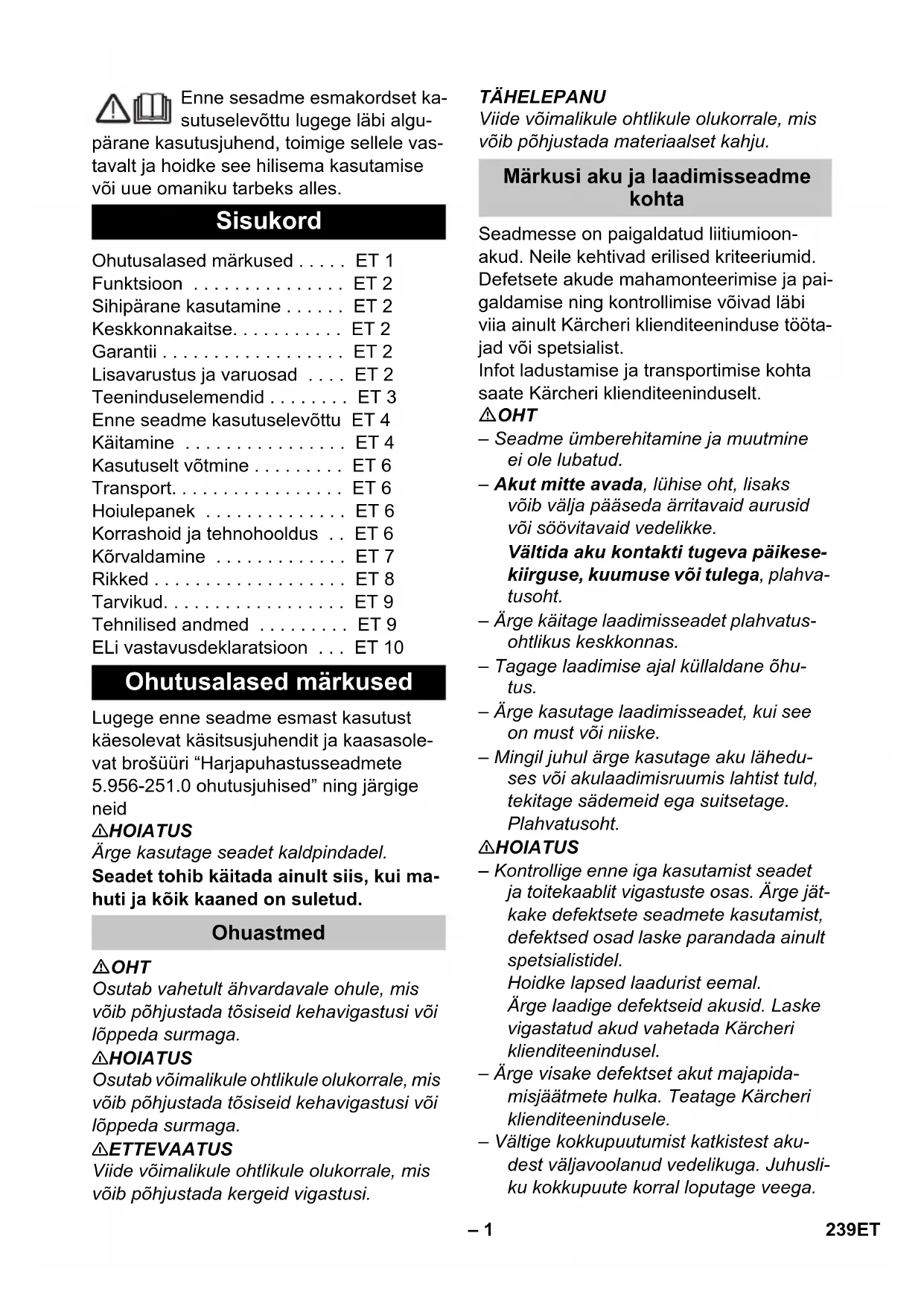Тип: 1.783-xxx Намиращи приложение Директиви на ЕC: 2006/42/EO (+2009/127/EO) 2014/30/ЕC 2011/65/EU 2014/53/EU (TCU) Намерили приложение хармонизира- ни стандарти: EN 60335–1 EN 60335–2–72 EN 60335-2-29 EN 55012: 2007 + A1: 2009 EN 55014-1:2006 + A1: 2009 + A2:2011 EN 55014–2: 1997 + A1: 2001 + A2: 2008 EN 61000–3–2: 2014 EN 61000–3–3: 2013 EN 61000–6–2: 2005 EN 62233: 2008 EN IEC 63000: 2018 Приложими национални стандарти TCU EN 301 511 V12.5.1 EN 300 440 V2.1.1 EN 300 328 V2.2.2 EN 300 330 V2.1.1 Chairman of the Board of Management Director Regulatory Affairs & Certification 238 BG– 1 Enne sesadme esmakordset ka- sutuselevõttu lugege läbi algu- pärane kasutusjuhend, toimige sellele vas- tavalt ja hoidke see hilisema kasutamise või uue omaniku tarbeks alles. Lugege enne seadme esmast kasutust käesolevat käsitsusjuhendit ja kaasasole- vat brošüüri “Harjapuhastusseadmete 5.956-251.0 ohutusjuhised” ning järgige neid 몇 HOIATUS Ärge kasutage seadet kaldpindadel. Seadet tohib käitada ainult siis, kui ma- huti ja kõik kaaned on suletud. OHT Osutab vahetult ähvardavale ohule, mis võib põhjustada tõsiseid kehavigastusi või lõppeda surmaga. 몇 HOIATUS Osutab võimalikule ohtlikule olukorrale, mis võib põhjustada tõsiseid kehavigastusi või lõppeda surmaga. 몇 ETTEVAATUS Viide võimalikule ohtlikule olukorrale, mis võib põhjustada kergeid vigastusi. TÄHELEPANU Viide võimalikule ohtlikule olukorrale, mis võib põhjustada materiaalset kahju. Seadmesse on paigaldatud liitiumioon- akud. Neile kehtivad erilised kriteeriumid. Defetsete akude mahamonteerimise ja pai- galdamise ning kontrollimise võivad läbi viia ainult Kärcheri klienditeeninduse tööta- jad või spetsialist. Infot ladustamise ja transportimise kohta saate Kärcheri klienditeeninduselt. OHT – Seadme ümberehitamine ja muutmine ei ole lubatud. – Akut mitte avada, lühise oht, lisaks võib välja pääseda ärritavaid aurusid või söövitavaid vedelikke. Vältida aku kontakti tugeva päikese- kiirguse, kuumuse või tulega, plahva- tusoht. – Ärge käitage laadimisseadet plahvatus- ohtlikus keskkonnas. – Tagage laadimise ajal küllaldane õhu- tus. – Ärge kasutage laadimisseadet, kui see on must või niiske. – Mingil juhul ärge kasutage aku lähedu- ses või akulaadimisruumis lahtist tuld, tekitage sädemeid ega suitsetage. Plahvatusoht. 몇 HOIATUS – Kontrollige enne iga kasutamist seadet ja toitekaablit vigastuste osas. Ärge jät- kake defektsete seadmete kasutamist, defektsed osad laske parandada ainult spetsialistidel. Hoidke lapsed laadurist eemal. Ärge laadige defektseid akusid. Laske vigastatud akud vahetada Kärcheri klienditeenindusel. – Ärge visake defektset akut majapida- misjäätmete hulka. Teatage Kärcheri klienditeenindusele. – Vältige kokkupuutumist katkistest aku- dest väljavoolanud vedelikuga. Juhusli- ku kokkupuute korral loputage veega. Sisukord Ohutusalased märkused . . . . . ET 1 Funktsioon . . . . . . . . . . . . . . . ET 2 Sihipärane kasutamine . . . . . . ET 2 Keskkonnakaitse. . . . . . . . . . . ET 2 Garantii . . . . . . . . . . . . . . . . . . ET 2 Lisavarustus ja varuosad . . . . ET 2 Teeninduselemendid . . . . . . . . ET 3 Enne seadme kasutuselevõttu ET 4 Käitamine . . . . . . . . . . . . . . . . ET 4 Kasutuselt võtmine . . . . . . . . . ET 6 Transport. . . . . . . . . . . . . . . . . ET 6 Hoiulepanek . . . . . . . . . . . . . . ET 6 Korrashoid ja tehnohooldus . . ET 6 Kõrvaldamine . . . . . . . . . . . . . ET 7 Rikked . . . . . . . . . . . . . . . . . . . ET 8 Tarvikud. . . . . . . . . . . . . . . . . . ET 9 Tehnilised andmed . . . . . . . . . ET 9 ELi vastavusdeklaratsioon . . . ET 10 Ohutusalased märkused Ohuastmed Märkusi aku ja laadimisseadme kohta 239ET– 2 Kui akuvedelikku sattub silma, tuleb li- saks pöörduda arsti poole. 몇 ETTEVAATUS – Seda kasutusjuhendit tuleb kindlasti jär- gida. Järgige seadusandja soovitusi akude käitlemise kohta. – Võrgupinge peab vastama seadme tüü- bisildil märgitud pingele. – Kasutage laadimisseadet ainult heaks- kiidetud akupakkide laadimiseks. – Akut võib käitada ainult selle seadme- ga, selle kasuamine muul eesmärgil on keelatud ja ohtlik. Kui turvalüliti lahti lasta, lülitub harjaajam välja. Seda küürimisumurit kasutatakse tasaste põrandate märgpuhastuseks. Veekogust reguleerides on seda kerge ko- handada vastavalt puhastamisvajadusele. 350 mm töölaius ja 12 l värske vee ning musta vee paak võimaldavad tõhusalt ja kaua puhastada. Akut saab laadida integreeritud laaduri abil 230 V pistikupesast. Kasutage antud seadet ainult vastavalt ka- sutusjuhendi andmetele. – Käesolev seade sobib professionaal- seks kasutuseks, nt hotellides, kooli- des, haiglates, vabrikutes, poodides, büroodes ja rendifirmades. – Seadet tohib kasutada ainult niiskus- kindlate siledate põrandate puhastami- seks. – See seade on ette nähtud kasutami- seks siseruumides. – Seade ei sobi külmunud põrandate pu- hastamiseks (nt külmhoonetes). – Seadet tohib varustada ainult originaal- tarvikute ja -varuosadega. Pakendmaterjalid on taaskasutata- vad. Palun ärge visake pakendeid majapidamisprahi hulka, vaid suunake need taaskasutusse. Vanad seadmed sisaldavad taaska- sutatavaid materjal, mis tuleks suu- nata taaskasutusse. Palun likvideeri- ge vanad seadmed seetõttu vastavate ko- gumissüsteemide kaudu. Märkusi koostisainete kohta (REACH) Aktuaalse info koostisainete kohta leiate aadressilt: www.kaercher.de/REACH Igas riigis kehtivad meie volitatud müü- giesindaja antud garantiitingimused. Tarvi- kutel esinevad rikked kõrvaldame garan- tiiajal tasuta, kui põhjuseks on materjali- või valmistusviga. Garantiijuhtumi korral palu- me pöörduda müüja või lähima volitatud klienditeenistuse poole, esitades ostu tõen- dava dokumendi. Kasutage ainult originaaltar