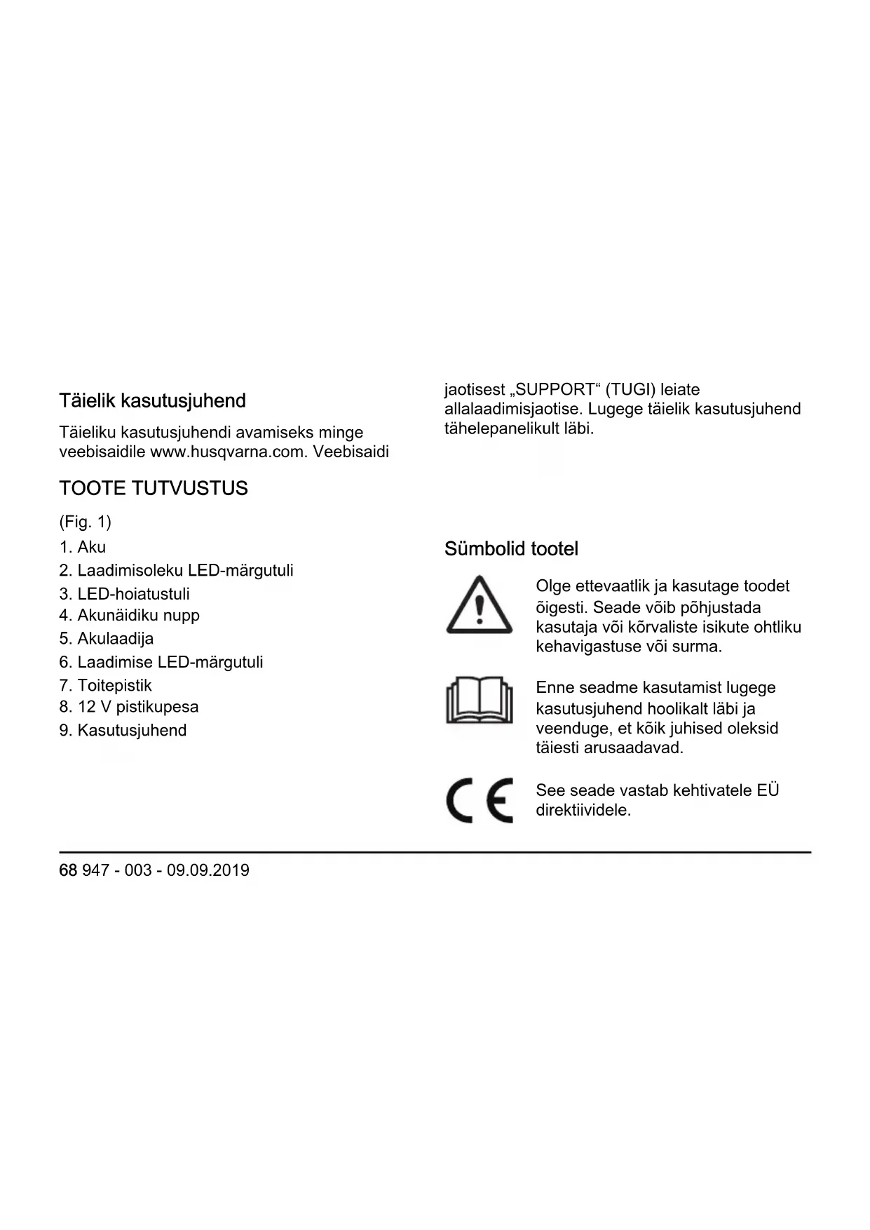 Sümbolid tootel Olge ettevaatlik ja kasutage toodet õigesti. Seade võib põhjustada kasutaja või kõrvaliste isikute ohtliku kehavigastuse või surma. Enne seadme kasutamist lugege kasutusjuhend hoolikalt läbi ja veenduge, et kõik juhised oleksid täiesti arusaadavad. See seade vastab kehtivatele EÜ direktiividele. 68 947 - 003 - 09.09.2019Toode või toote pakend ei kuulu olmejäätmete hulka. Toimetage see elektri- ja elektroonikajäätmete heakskiidetud jäätmejaama. Hoidke eemal veest ja vihmast. Kasutage ja hoiustage akulaadijat ainult siseruumides. Märkus: Seadmel toodud ülejäänud sümbolid/ tähised viitavad teatud kommertsvaldkondade sertifitseerimisnõuetele.