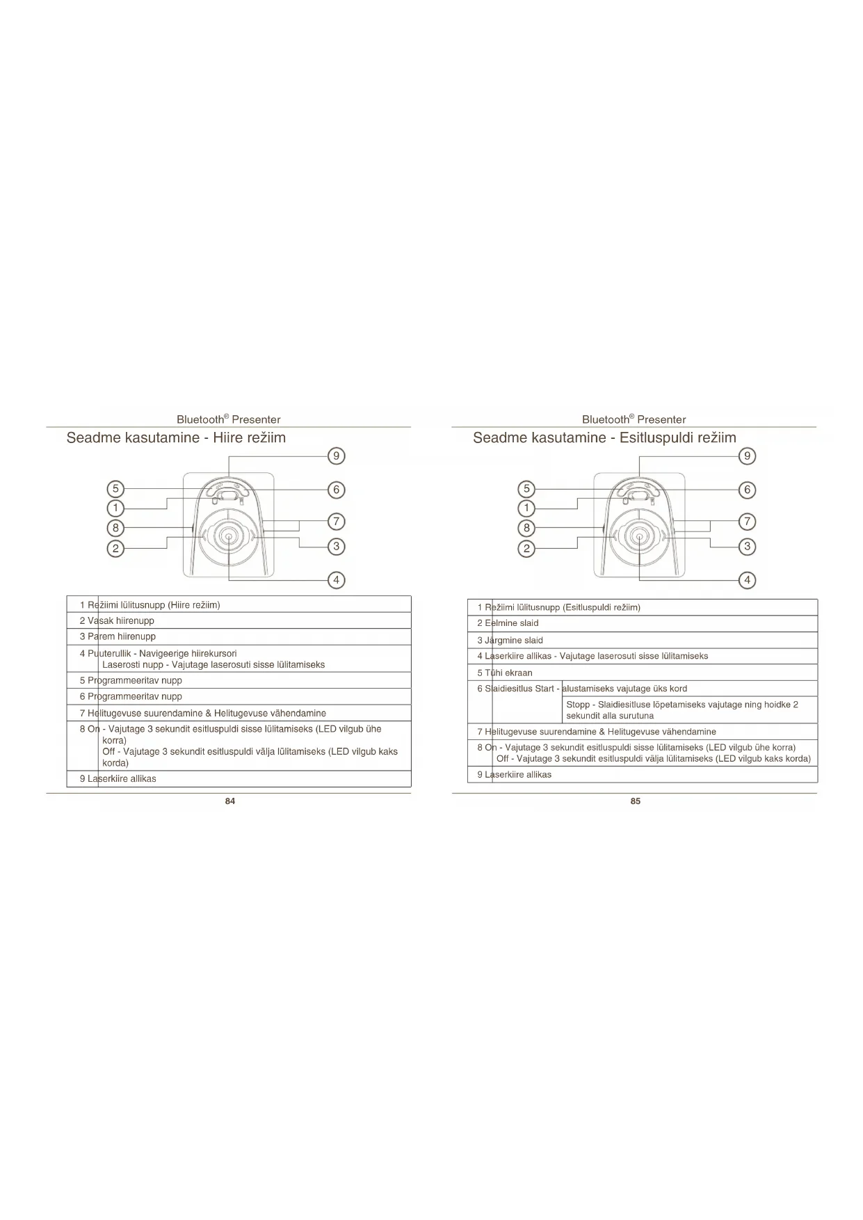 Seadme kasutamine - Esitluspuldi režiim 1 Režiimi lülitusnupp (Esitluspuldi režiim) 2 Eelmine slaid 3 Järgmine slaid 4 Laserkiire allikas - Vajutage laserosuti sisse lülitamiseks 5 Tühi ekraan 6 Slaidiesitlus Start - alustamiseks vajutage üks kord Stopp - Slaidiesitluse lõpetamiseks vajutage ning hoidke 2 sekundit alla surutuna 7 Helitugevuse suurendamine & Helitugevuse vähendamine 8 On - Vajutage 3 sekundit esitluspuldi sisse lülitamiseks (LED vilgub ühe korra) Off - Vajutage 3 sekundit esitluspuldi välja lülitamiseks (LED vilgub kaks korda) 9 Laserkiire allikas