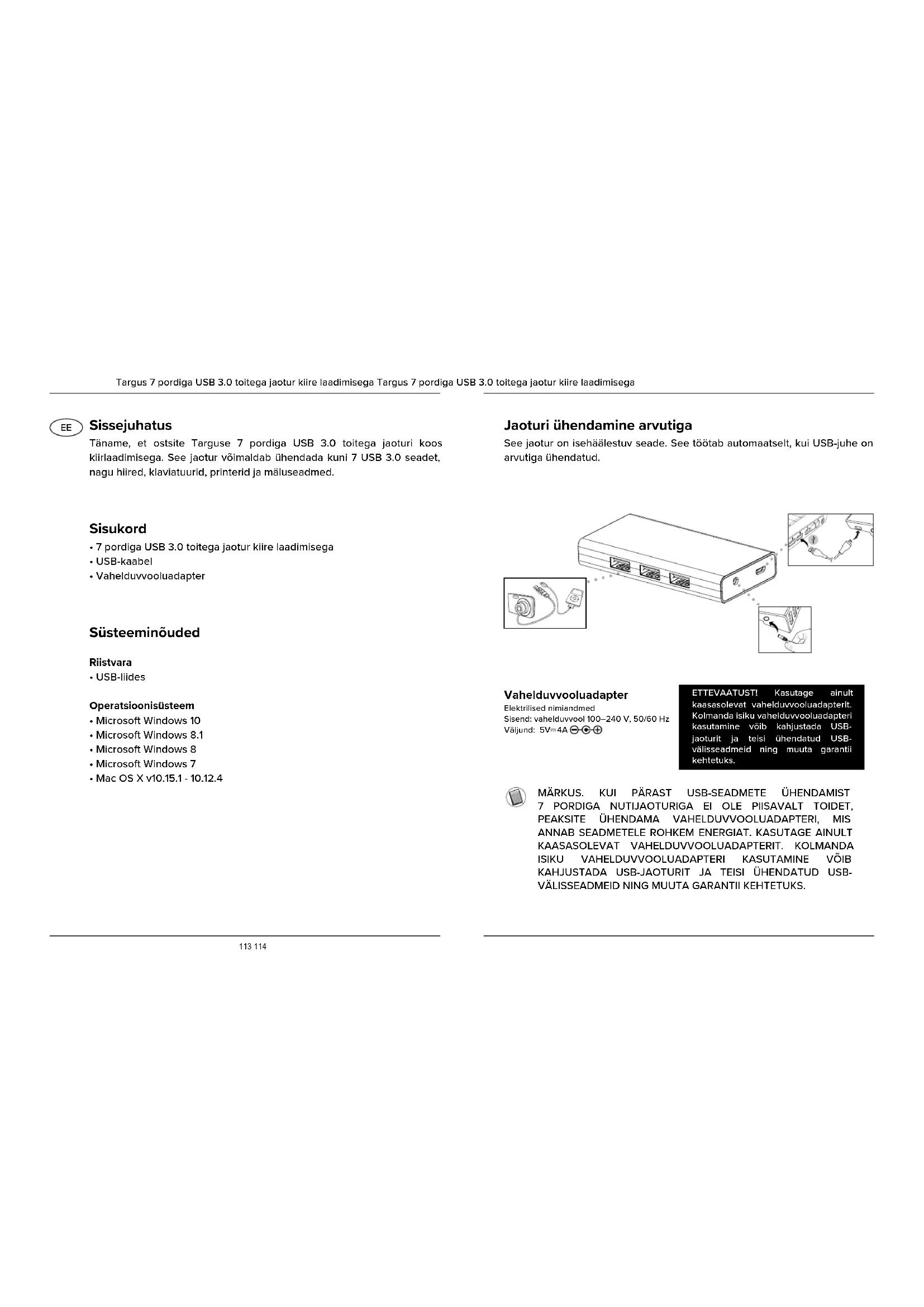 VÄLISSEADMEID NING MUUTA GARANTII KEHTETUKS. Vahelduvvooluadapter Elektrilised nimiandmedSisend: vahelduvvool 100–240 V, 50/60 HzVäljund: 5V 4A ETTEVAATUST! Kasutage ainult kaasasolevat vahelduvvooluadapterit. Kolmanda isiku vahelduvvooluadapteri kasutamine võib kahjustada USB-jaoturit ja teisi ühendatud USB-välisseadmeid ning muuta garantii kehtetuks.115 116 Seadme kirjeldus Targus 7 pordiga USB 3.0 toitega jaotur kiire laadimisega USB 3.0 ülesvooluport (ühendatakse arvutiga) Vahelduvvooluadapteri toitepesa USB 3.0 pordid USB 3.0 kiirlaadimispordidUSB 3.0 port USB 3.0 port Esikülg Külg KülgTagakülg USB 3.0 pordid