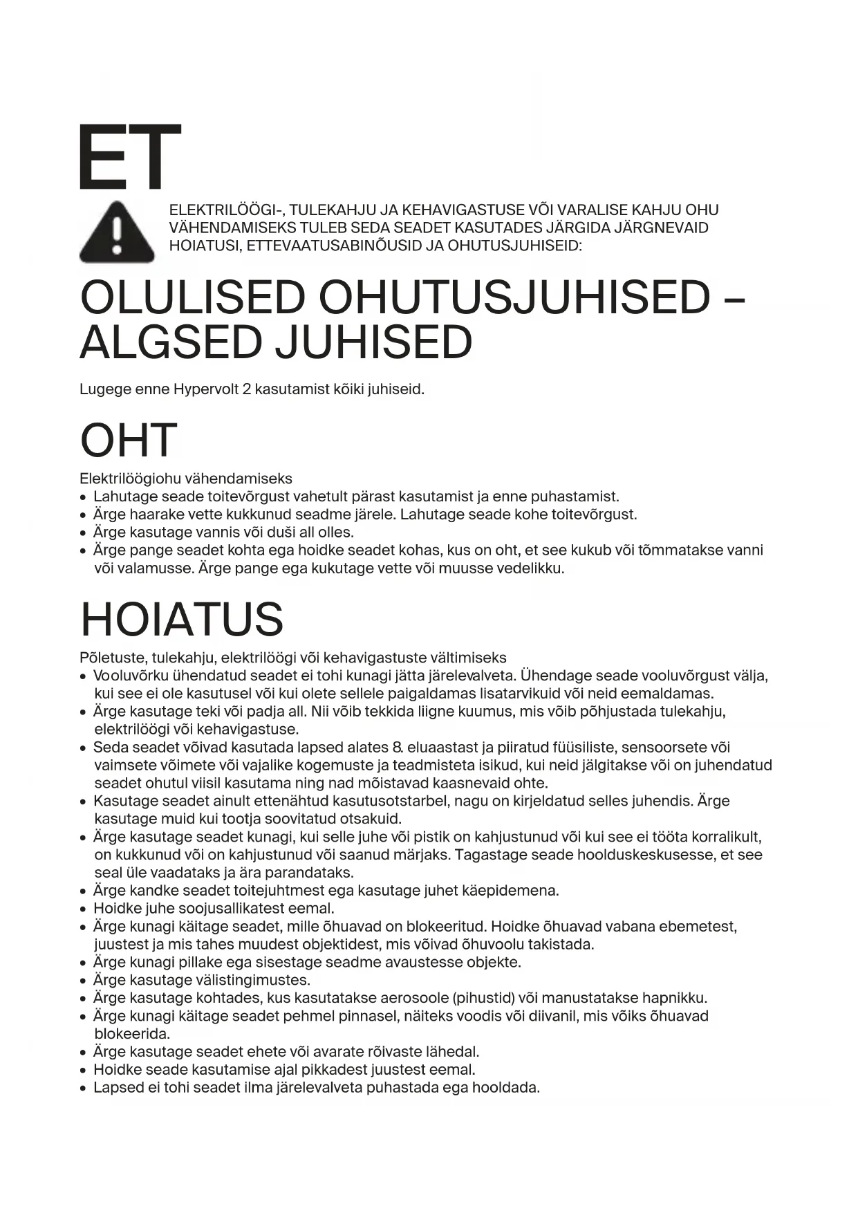 - Rasedus; diabeet, millega kaasnevad tüsistused, nagu neuropaatia või võrkkesta kahjustus; südamestimulaatori kasutamine; hiljutine operatsioon; epilepsia või migreen; diski väljasopistus; spondülolistees; spondülolüüs või spondüloos; hiljutine liigeseproteesi paigaldus; emakasisene seade; metallvardad või plaadid; või mõni muu mure oma tervise pärast. Nõrga tervisega inimesed ja lapsed võivad löök- ja vibratsiooniseadmeid kasutada täiskasvanu järelevalve all. Need vastunäidustused ei tähenda, et nende korral ei saa löök- või vibratsiooniseadmeid kasutada, kuid me soovitame enne pidada nõu arstiga. Uuringud löökmassaažiga meditsiinilistele häiretele avalduvate mõjude kohta veel käivad ja nende tulemused võivad lühendada ülaltoodud vastunäidustuste loetelu. Hypervolt 2 sisaldab akut, mida tuleb käidelda ohutul viisil ja viia see nõuetekohasesse elektroonikaseadmete jäätmete kogumiskohta. ETTEVAATUST Seadmes paiknev aku võib vale kasutamise korral põhjustada põletusi või keemilisi põletusi. Seda ei tohi võtta osadeks, kuumutada temperatuurile üle 100ºC või põletada. Kõrvaldage kasutatud aku kiiresti kasutuselt. Hoida laste käeulatusest eemal. Ärge võtke seda osadeks ega visake seda tulle.