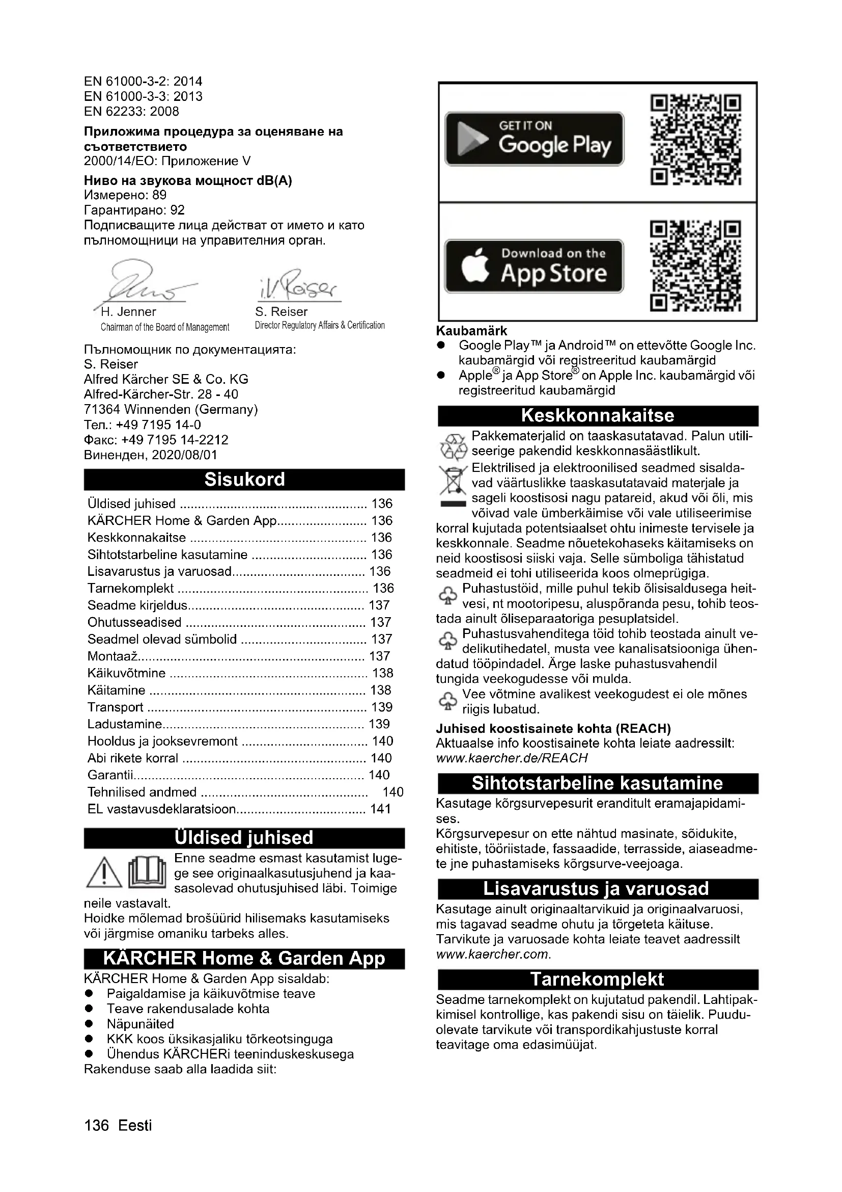 • on Apple Inc. kaubamärgid või registreeritud kaubamärgid Keskkonnakaitse Pakkematerjalid on taaskasutatavad. Palun utili- seerige pakendid keskkonnasäästlikult. Elektrilised ja elektroonilised seadmed sisalda- vad väärtuslikke taaskasutatavaid materjale ja sageli koostisosi nagu patareid, akud või õli, mis võivad vale ümberkäimise või vale utiliseerimise korral kujutada potentsiaalset ohtu inimeste tervisele ja keskkonnale. Seadme nõuetekohaseks käitamiseks on neid koostisosi siiski vaja. Selle sümboliga tähistatud seadmeid ei tohi utiliseerida koos olmeprügiga. Puhastustöid, mille puhul tekib õlisisaldusega heit- vesi, nt mootoripesu, aluspõranda pesu, tohib teos- tada ainult õliseparaatoriga pesuplatsidel. Puhastusvahenditega töid tohib teostada ainult ve- delikutihedatel, musta vee kanalisatsiooniga ühen- datud tööpindadel. Ärge laske puhastusvahendil tungida veekogudesse või mulda. Vee võtmine avalikest veekogudest ei ole mõnes riigis lubatud. Juhised koostisainete kohta (REACH) Aktuaalse info koostisainete kohta leiate aadressilt: www.kaercher.de/REACH Sihtotstarbeline kasutamine Kasutage kõrgsurvepesurit eranditult eramajapidami- ses. Kõrgsurvepesur on ette nähtud masinate, sõidukite, ehitiste, tööriistade, fassaadide, terrasside, aiaseadme- te jne puhastamiseks kõrgsurve-veejoaga. Lisavarustus ja varuosad Kasutage ainult originaaltarvikuid ja originaalvaruosi, mis tagavad seadme ohutu ja tõrgeteta käituse. Tarvikute ja varuosade kohta leiate teavet aadressilt www.kaercher.com. Tarnekomplekt Seadme tarnekomplekt on kujutatud pakendil. Lahtipak- kimisel kontrollige, kas pakendi sisu on täielik. Puudu- olevate tarvikute või transpordikahjustuste korral teavitage oma edasimüüjat. Üldised juhised p. 136