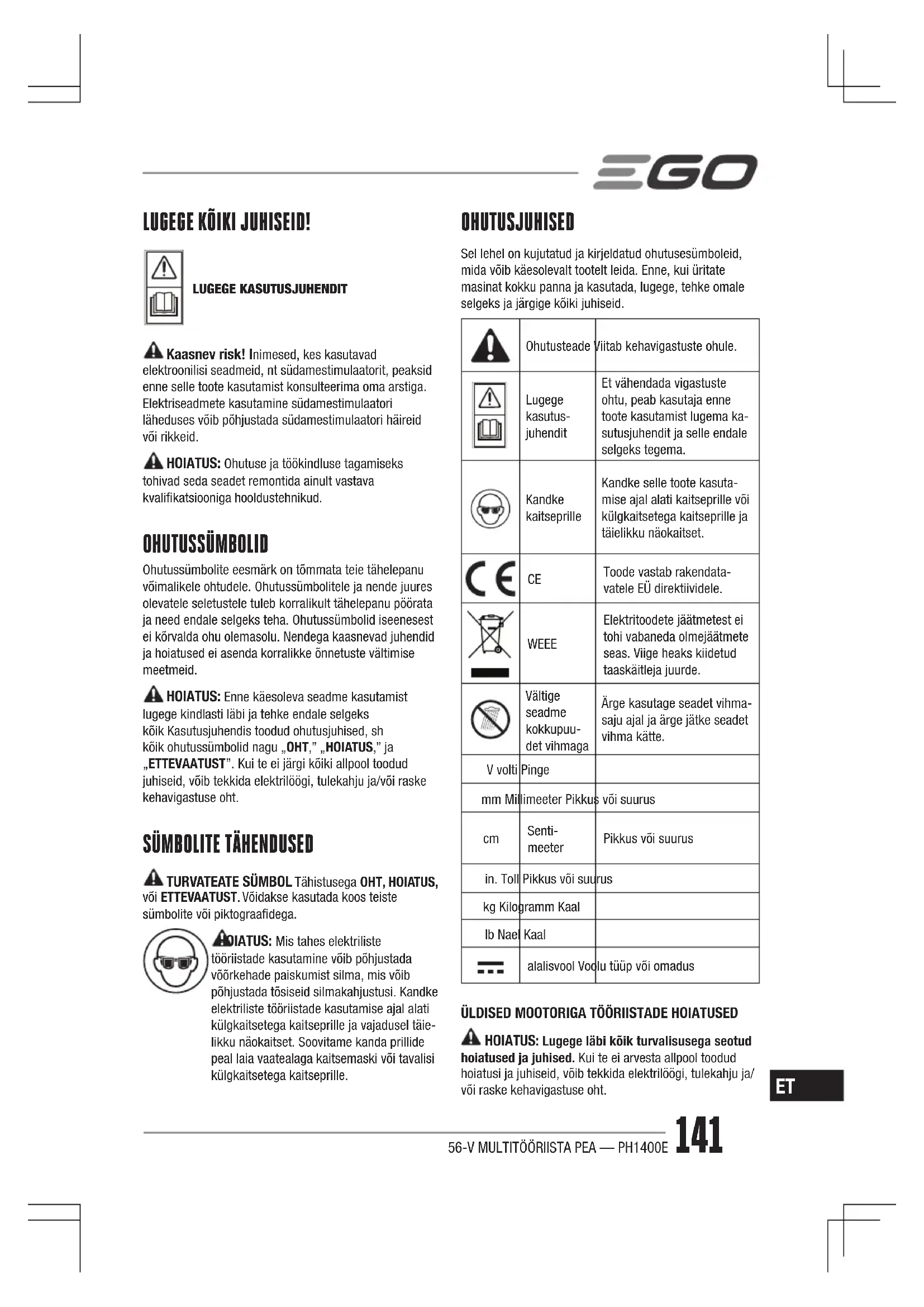 HOIATUS: Lugege läbi kõik turvalisusega seotud hoiatused ja juhised. Kui te ei arvesta allpool toodud hoiatusi ja juhiseid, võib tekkida elektrilöögi, tulekahju ja/ või raske kehavigastuse oht.56-V MULTITÖÖRIISTA PEA — PH1400E 142