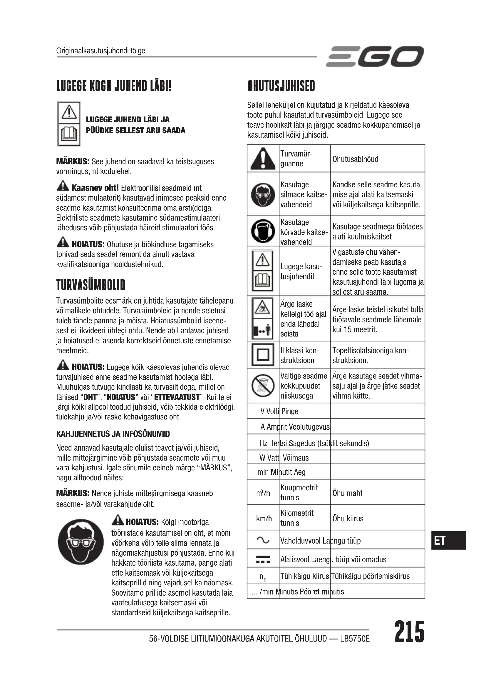 ◾ Ohutuse huvides jälgige regulaarselt, et kõik mutrid, poldid ja kruvid oleksid kinni. ◾ Vahetage kulunud või kahjustatud osad. ◾ Kasutage ainult originaaltarvikuid ja -varuosi. ◾ Ladustage seadet ainult kuivas kohas HOIATUS: Ohutuse ja töökindluse tagamiseks tohivad seda seadet remontida ainult vastava kvalifikat- siooniga hooldustehnikud. HOIATUS: Tulekahju, elektrilöögi või kehavigastuste ohu vähendamiseks: OLULINE ENNE KASUTAMIST LUGEGE TÄHELEPANELIKULT. HOIDKE ALLES. ◾ Tundke oma puhurit. Lugege juhend hoolikalt läbi. Tehke omale selgeks puhuti rakendusvõimalused ja piirangud, ning ka konkreetse seadmega seotud potentsiaalsed ohud. Selle reegli järgimine vähendab elektrilöögi, tulekahju ja tõsiste vigastuste ohtu. ◾ Ärge jätke puhurit vihma kätte ega niisketesse tingimustesse. Puhurisse sisenev vesi suurendab elektrilöögi ohtu. ◾ Ärge lubage puhuriga mängida. Kui kasutate tööriista laste lähedal või lasete seda kasutada lastel, olge väga tähelepanelik. ◾ Kasutage vaid selles juhendis kirjeldatud viisil. Kasutage ainult tootja soovitatud lisatarvikuid ◾ Kui puhur ei tööta nii nagu peab või kui seeon maha kukkunud, kahjustatud, õue jäetud või vette kukkunud, viige see hooldus-keskusesse. ◾ Ärge puudutage laadijat, laadija juhet ega laadija terminale märgade kätega. ◾ Ärge paigutage midagi seadme avadesse. Ärge kasutage seadet, kui mõni selle ava on ummistunud, hoidke avad vabana tolmust, narmastest, juustest ja muudest objektidest, mis võivad õhuvoolu takistada. ◾ Vältige juuste, avarate riiete, sõrmede ja teiste kehaosade kokkupuudet avade või liikuvate osadega. Liiga avarad riided, ehted ja pikad juuksed võivad õhuavadesse kinni jääda. ◾ Pange pikad juuksed õlgadest kõrgemale kinni, et välistada nende liikuvate osade vahele kinni jäämine. ◾ Treppide puhastamisel olge eriti ettevaatlik. ◾ Ärge laadige akuplokki välitingimustes. ◾ Laadimiseks kasutage ainult seadme tootja toodetud laadijat. ◾ Ärge jätke puhurit järelvalveta, kui aku on sellega ühendatud. Eemaldage aku, kui puhurit ei kasutata või hakkate seda hooldama. ◾ Ärge kasutage puhurit plahvatusohtlikus keskkonnas, kus leidub nt tuleohtlikke vedelikke, gaase või tolmu. Puhurid tekitavad sädemeid, mis võivad süüdata tolmu või aurusid. ◾ Kasutage aku jõul töötavat puhurit vaid vastava tähistusega akuplokiga. Mõne muu aku kasutamine võib põhjustada tulekahju. ◾ Kasutage ainult järgnevalt nimetatud akuplokke ja laadijaid: AKUPLOKK LAADIJA BA1120E, BA1400, BA2240E, BA2800, BA3360, BA4200, BAX1300 CH5500E, CH2100E HOIATUS: - Akuplokk tuleb seadmelt enne selle tööea lõppu eemaldada. - Aku käitlemisel tuleb järgida ohutusreegleid. ◾ Olge tähelepanelik, töötage hoolikalt ja kasutage tervet mõistust. Ärge kasutage puhurit, kui olete väsinud, vihane või tarvitanud narkootikume, alkoholi või ravimeid. Isegi hetkeline tähelepanematus puhuri kasutamise ajal võib põhjustada tõsiseid vigastusi.56-VOLDISE LIITIUMIOONAKUGA AKUTOITEL ÕHULUUD — LB5750E
