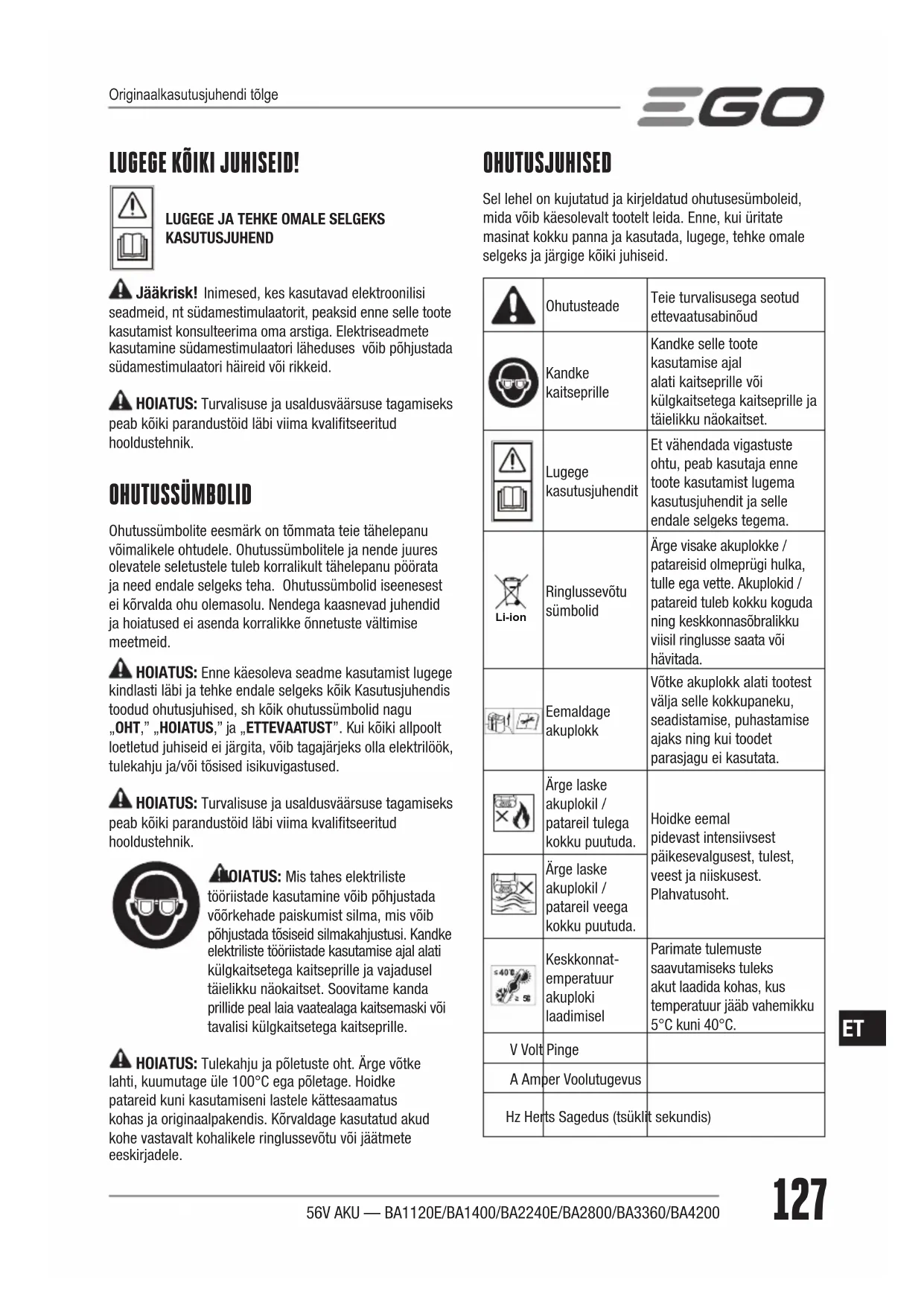Järgige konkreetse EGO toote kasutusjuhendit. HOOLDUS HOIATUS: Tõsiste isikuvigastuste vältimiseks eemaldage aku tööriistast alati lisatarvikute vahetamise, puhastamise ja hooldustööde teostamise ajaks. HOIATUS: Remondiks võib kasutada ainult identseid EGO originaalvaruosi. Mis tahes muude osade kasutamine võib põhjustada ohtlikke olukordi või seadet vigastada. HOIATUS: Aku puhastamiseks ei ole soovitatav kasutada kokkusurutud kuiva õhku. Kui kokkusurutud õhu kasutamine on ainus võimalik viis, kandke kindlasti näokaitset või külgkaitsetega kaitseprille. Kui tööpiirkond on tolmune, kandke ka tolmumaski. ÜLDINE HOOLDUS Vältige plastosade kasutamisel lahustite kasutamist. Enamik plastmasse on kaubanduslike lahustite suhtes tundlikud ja võivad nende kasutamisel kahjustada saada. Kasutage mustuse, tolmu, õli, määrete jms eemaldamiseks puhtaid riidest lappe. HOIATUS: Ärge kunagi laske pidurivedelikel, bensiinil, nafta baasil toodetel, läbitungivatel õlidel jms puutuda kokku plastosadega. Kemikaalid võivad plastikut vigastada, nõrgestada või hävitada, mille tulemusena võivad tekkida tõsised isikuvigastused. HOIATUS: LÜHISEST TULENEVA TULEKAHJU, ISIKUVIGASTUSE VÕI TOOTE KAHJUSTUMISE OHU VÄHENDAMISEKS ÄRGE KUNAGI UPUTAGE TÖÖRIISTA, AKUT VÕI LAADIJAT VEDELIKKU EGA LASKE VEDELIKUL SEADMETESSE VOOLATA. LÜHISE VÕIVAD PÕHJUSTADA KORROSIIVSED VÕI ELEKTRIT JUHTIVAD VEDELIKUD, NT. MEREVESI, TEATUD TÖÖSTUSLIKUD KEMIKAALID JA VALGENDI VÕI VALGENDIT SISALDAVAD TOOTED JNE. AKUD Akuplokki kuuluvad laetavad liitiumioonakud. Tööaeg pärast iga laadimist sõltub tehtava töö tüübist.Selle seadme akud on ette nähtud võimaldama maksimaalset probleemidevaba kasutusiga. Nagu kõik akud, vananevad lõpuks ka need.Ärge võtke akuplokki lahti ega üritage akusid välja vahetada. Akude käsitlemine, eriti sõrmuste ja ehete56V AKU — BA1120E/BA1400/BA2240E/BA2800/BA3360/BA4200