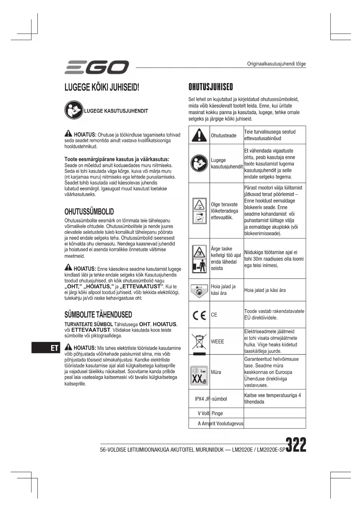KASUTAMISEL OHT: Selle masina kasutamisel tuleb järgida käesolevas juhendis kirjeldatud ohutusreegleid. Nagu kõigi elektriliste tööriistade puhul, võib ka antud seadmega hooletult ringi käies põhjustada raskeid vigastusi. Seade võib vigastada jalgu või käsi ja lennutada objekte. Turvanõuete eiramisel võite põhjustada raskeid või surmavaid vigastusi.56-VOLDISE LIITIUMIOONAKUGA AKUTOITEL MURUNIIDUK — LM2020E / LM2020E-SP 325