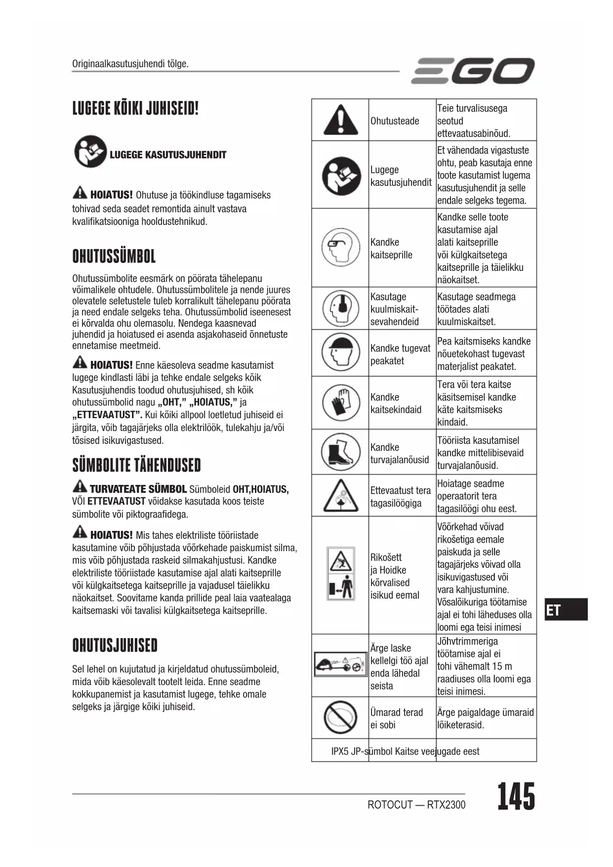 Minutis Pööret minutisAlalisvool Voolu tüüp või omaduskg Kilogramm Kaal OLULISED OHUTUSJUHISED HOIATUS! Lugege läbi kõik elektritööriistaga kaasas olevad hoiatused, juhised, joonised ja andmed. Alltoodud juhiste eiramine võib põhjustada elektrilööki, tulekahju ja/või raskeid vigastusi.Säilitage hoiatused ja juhised hilisemaks kasutuseks. ◾ Vältige ohtlikke keskkondi – ärge kasutage seadmeid niisketel või märgadel kallakutel. ◾ Hoidke piirded omal kohal ja töökorras. ◾ Hoidke käed ja jalad lõikealast eemal. ◾ Vigastuste esinemise ohu vähendamiseks ärge kunagi kasutage seda seadet, kui seisate redelil või muul ebakindlal pinnal. Ärge kunagi hoidke lõiketarvikut vöökohast kõrgemal. ◾ Kontrollige lõiketarviku seisukorda töötamise ajal regulaarselt ja sagedasti või koheselt kui ilmneb märgatav muutus lõikeseadmete töös. ◾ Parimate tulemuste saavutamiseks tuleks laadida akut keskkonnas, mille temperatuur jääb vahemikku 5°C kuni 40°C. Ärge hoiustage akut välistingimustes või sõidukites. ◾ Kui keegi teile läheneb, seisake mootor ja lõiketarvik koheselt. ◾ Hoiatage seadme operaatorit tera tagasilöögi ohu eest. ◾ Tera tagasilöök võib esineda siis, kui pöörlev tera puutub kokku esemega, mida see koheselt läbi ei lõika. ◾ Tera tagasilöök võib olla piisavalt tugev, et tööriista ja/ või selle operaatorit suvalises suunas lennutada ning võib juhtuda, et operaator kaotab seadme üle kontrolli. ◾ Tera tagasilöök võib tekkida ootamatult, kui tera puruneb, seiskub või paindub. ◾ Tera tagasilöögi esinemine on tõenäolisem piirkondades, kus lõigatavat materjali on raske näha. ◾ Ärge paigaldage seadme külge ühtegi tera ilma kõigi nõutavate osadeta. Õigete osade kasutamata jätmise korral võib tera seadme küljest minema lennata ning selle operaatorit ja/või kõrvalisi isikuid tõsiselt vigastada. Visake ära kõik paindunud, kõverdunud, pragunenud, katkised või muul moel kahjustunud terad. Kasutage teravaid lõiketerasid. Nüri lõiketera võib kergemini puruneda või tagasilööki anda. ◾ Tühikäigul pöörlev tera/jõhv võib tekitada vigastusi, sest see jätkab pöörlemist ka siis, kui mootor on peatunud ja päästik vabastatud. Säilitage kontroll seadme üle kuni tera/jõhv on pöörlemise täielikult lõpetanud. ◾ Akuga töötavaid tööriistu pole vaja vooluvõrku ühendada, seega on nad alati töörežiimis. Olge teadlik võimalikest ohtudest ka ajal, mil tööriist pole sisse lülitatud. Seadme hooldamise või remontimise ajal olge ettevaatlik. ◾ Ärge peske voolikuga, vältige vee sattumist mootorisse ja elektriühenduste peale. ◾ Kui esineb olukordi, mida pole käesolevas juhendis kirjeldatud, käituge hoolsalt ja lähtuge tervest mõistusest. Küsige abi EGO hoolduskeskusest.HOIDKE SEE KASUTUSJUHEND ALLES! SPETSIFIKATSIOONID Tühikäik Kuni 450/minLõiketera ABR2300Soovituslik töökeskkonna temperatuur0°C-40°CSoovituslik hoiustamise temperatuur-20°C-70°COptimaalne laadimistemperatuur5°C-40°CKaal 1,9 kgROTOCUT — RTX2300