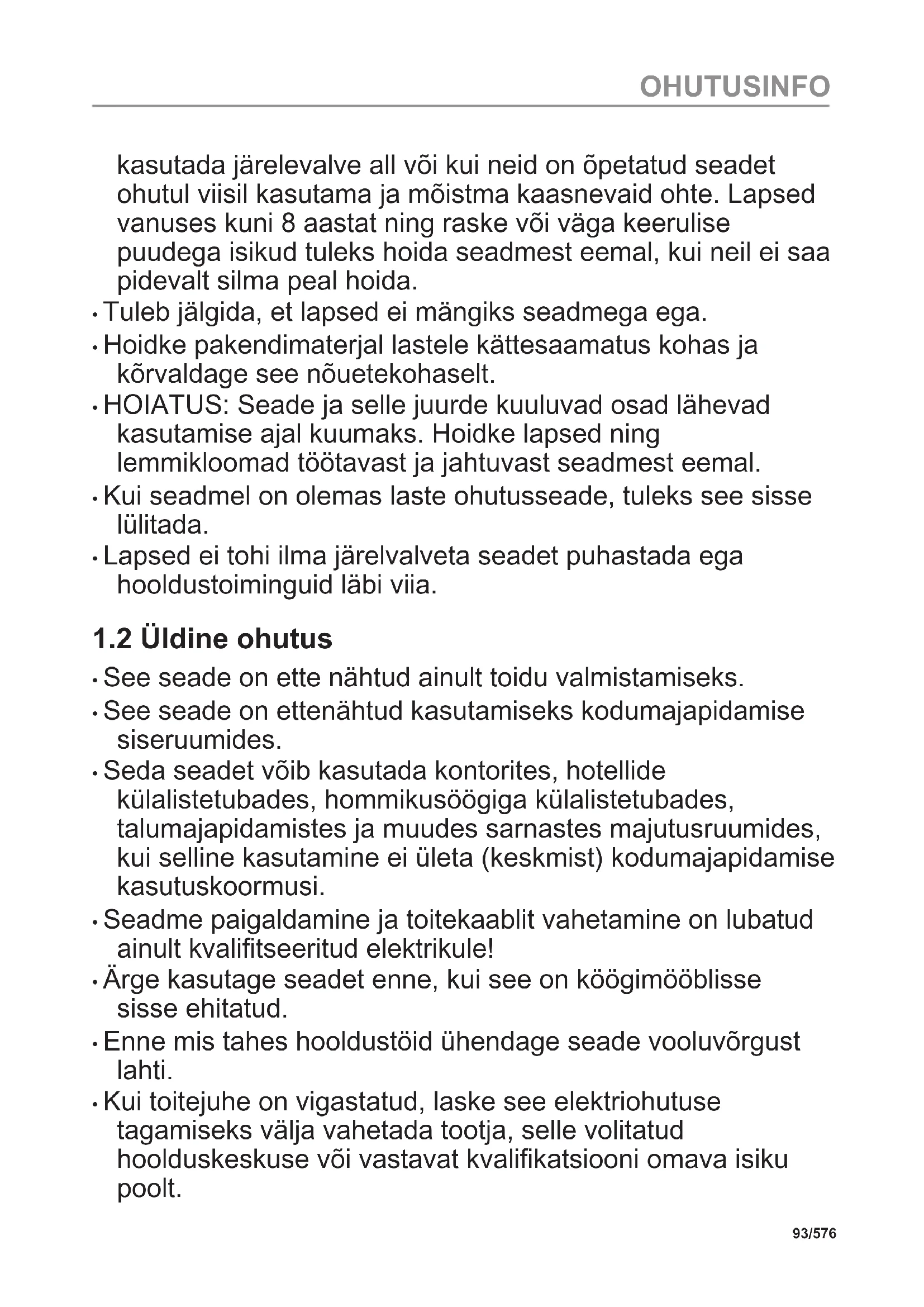- Vähemalt 8-aastased ja vanemad lapsed ning piiratud füüsiliste, sensoorsete või vaimsete võimete või väheste kogemuste ja teadmistega isikud tohivad seda seadet 92/576 OHUTUSINFOkasutada järelevalve all või kui neid on õpetatud seadet ohutul viisil kasutama ja mõistma kaasnevaid ohte. Lapsed vanuses kuni 8 aastat ning raske või väga keerulise puudega isikud tuleks hoida seadmest eemal, kui neil ei saa pidevalt silma peal hoida.