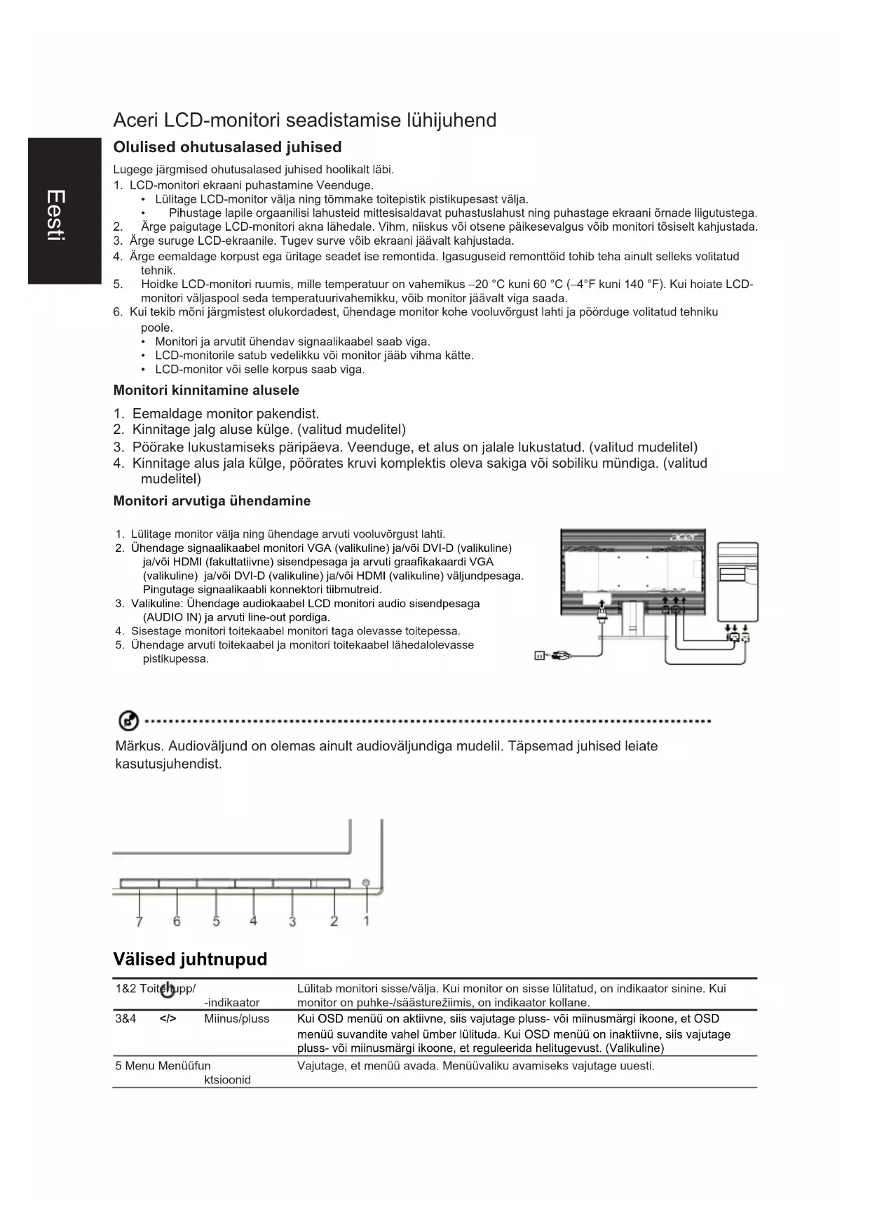 mudelitel) Monitori arvutiga ühendamine 1. Lülitage monitor välja ning ühendage arvuti vooluvõrgust lahti.2. Ühendage signaalikaabel monitori VGA (valikuline) ja/või DVI-D (valikuline) ja/võiHDMI(fakultatiivne)sisendpesagajaarvutigraakakaardiVGA(valikuline) ja/või DVI-D (valikuline) ja/või HDMI (valikuline) väljundpesaga. Pingutage signaalikaabli konnektori tiibmutreid.3. Valikuline: Ühendage audiokaabel LCD monitori audio sisendpesaga (AUDIO IN) ja arvuti line-out pordiga.4. Sisestage monitori toitekaabel monitori taga olevasse toitepessa.5. Ühendage arvuti toitekaabel ja monitori toitekaabel lähedalolevasse pistikupessa. Märkus. Audioväljund on olemas ainult audioväljundiga mudelil. Täpsemad juhised leiate kasutusjuhendist. Välised juhtnupud 1&2 Toitenupp/-indikaatorLülitab monitori sisse/välja. Kui monitor on sisse lülitatud, on indikaator sinine. Kui monitoronpuhke-/säästurežiimis,onindikaatorkollane. 3&4 </> Miinus/pluss Kui OSD menüü on aktiivne, siis vajutage pluss- või miinusmärgi ikoone, et OSD menüü suvandite vahel ümber lülituda. Kui OSD menüü on inaktiivne, siis vajutage pluss- või miinusmärgi ikoone, et reguleerida helitugevust. (Valikuline)5 Menu MenüüfunktsioonidVajutage, et menüü avada. Menüüvaliku avamiseks vajutage uuesti.Eesti 6 Auto Auto Kui OSD menüü on aktiivne, siis vajutage OSD menüüst väljumiseks nuppu Auto. Kui OSD menüü on inaktiivne, siis vajutage nuppu Auto, et monitor optimeeriks automaatselt kuva asendit, fookust ja taktsagedust. 7 Nupp Empowering a. Kui OSD menüü on aktiivne, siis toimib see nupp Exit-klahvina (OSD menüüst väljumine). b. KuiOSDmenüüoninaktiivne,siisvajutagesedanuppurežiimiStsenaarium valimiseks. Eeskirjad ja ohutusteatised FCC teatis Seadet on katsetatud ning katsete tulemused näitavad, et seade vastab FCC eeskirjade osas 15 sätestatud B-klassi digitaalseadmele kehtivatele piirmääradele. Need piirmäärad peaksid tagama mõistlikus ulatuses kaitse ohtlike raadiohäirete eest elamukeskkonnas. Seade genereerib ja kasutab raadiosageduslikke voole ning võib kiirata raadiosageduslikku kiirgust, mis võib põhjustada raadioside kahjulikke häireid, kui seadet ei paigaldada ja kasutata kooskõlas juhistega.Siiski ei saa ka kõigi juhiste täitmisel tagada, et konkreetses paigaldises häireid ei teki. Kui seade põhjustab raadio- või televisioonivastuvõtu kahjulikke häireid, mille kindlakstegemiseks võib seadme välja ja uuesti sisse lülitada, soovitame võtta häirete kõrvaldamiseks ühe või mitu järgmistest meetmetest.