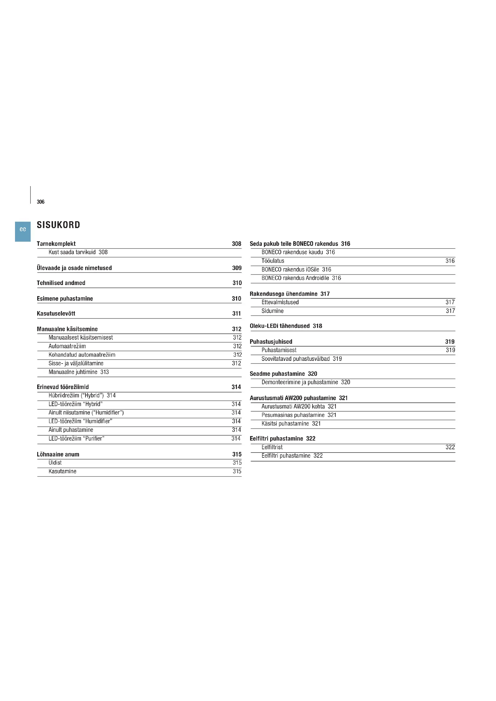 Seda pakub teile BONECO rakendus 316 BONECO rakenduse kaudu 316 Tööulatus 316 BONECO rakendus iOSile 316 BONECO rakendus Androidile 316 Rakendusega ühendamine 317 Ettevalmistused 317 Sidumine 317 Oleku-LEDi tähendused 318 Puhastusjuhised 319 Puhastamisest 319 Soovitatavad puhastusvälbad 319 Seadme puhastamine 320 Demonteerimine ja puhastamine 320 Aurustusmati AW200 puhastamine 321 Aurustusmati AW200 kohta 321 Pesumasinas puhastamine 321 Käsitsi puhastamine 321 Eelfiltri puhastamine 322 Eelfiltrist 322 Eelfiltri puhastamine 322 Tarnekomplekt 308 Kust saada tarvikuid 308 Ülevaade ja osade nimetused 309 Tehnilised andmed 310 Esimene puhastamine 310 Kasutuselevõtt 311 Manuaalne käsitsemine 312 Manuaalsest käsitsemisest 312 Automaatrežiim 312 Kohandatud automaatrežiim 312 Sisse- ja väljalülitamine 312 Manuaalne juhtimine 313 Erinevad töörežiimid 314 Hübriidrežiim (“Hybrid”) 314 LED-töörežiim “Hybrid” 314 Ainult niisutamine (“Humidifier”) 314 LED-töörežiim “Humidifier” 314 Ainult puhastamine 314 LED-töörežiim “Purifier” 314 Lõhnaaine anum 315 Üldist 315 Kasutamine 315 SISUKORDTarvikute vahetamine 323 Ionic Silver Stick
