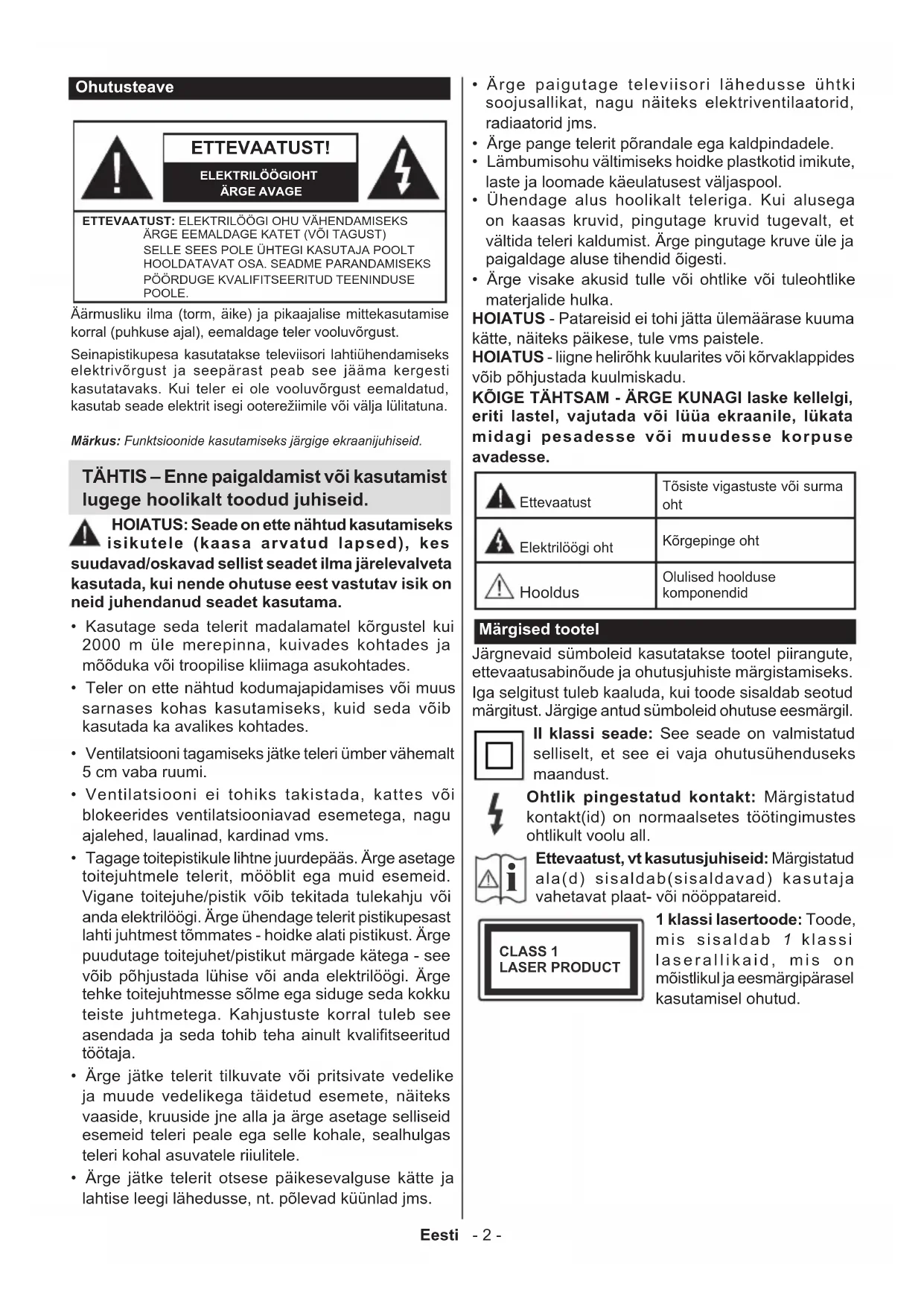 Ettevaatust, vt kasutusjuhiseid: Märgistatud ala(d) sisaldab(sisaldavad) kasutaja vahetavat plaat- või nööppatareid. CLASS 1 LASER PRODUCT 1 klassi lasertoode: Toode, mis sisaldab 1 klassi laserallikaid, mis on mõistlikul ja eesmärgipärasel kasutamisel ohutud.Eesti - 3 - HOIATUS Ärge neelake patareid alla, keemilise söövituse oht See toode või tootega kaasasolevad lisatarvikud võivad sisaldada nööppatareisid. Kui plaatpatarei neelatakse alla, võib see põhjustada tõsiseid sisemisi põletusi 2 tunni jooksul ja viia isegi surmani. Hoidke uusi ja kasutatud patareisid lastele kättesaamatus kohas. Kui patareipesa ei sulgu kindlalt, lõpetage toote kasutamine ja hoidke seda väljaspool laste haardeulatust. Kui te kahtlustate, et patarei võib olla alla neelatud või sisestatud mistahes kehaosasse, pöörduge koheselt arsti poole. – – – – – – – – – – – – Ärge kunagi asetage telerit ebastabiilsesse kohta ega kaldpinnale. Teler võib kukkuda, põhjustades tõsiseid kehavigastusi või surma. Paljusid vigastusi, eriti laste puhul, on võimalik järgmisi lihtsaid ohutusjuhiseid rakendades ennetada: