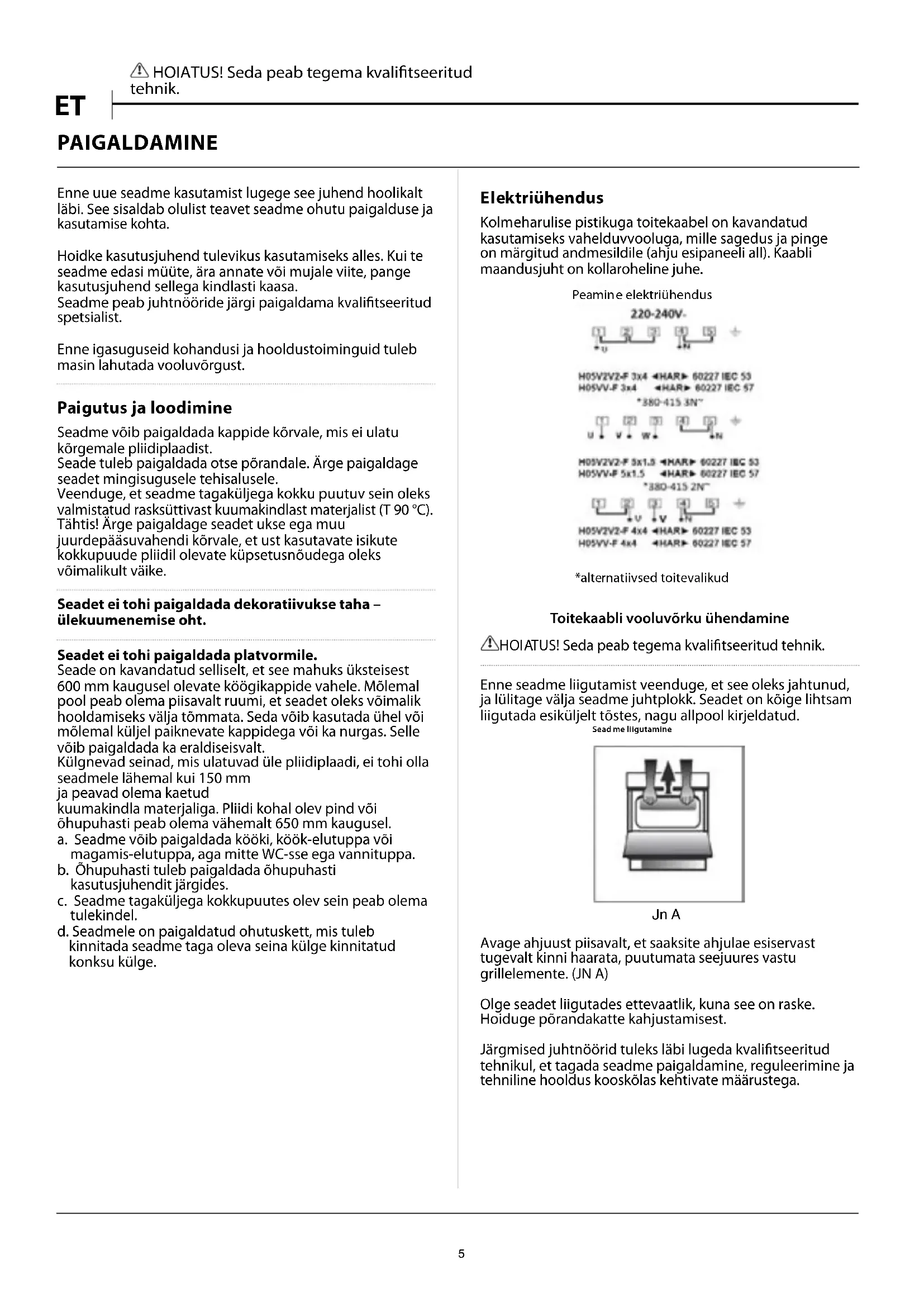 TUS! Seda peab tegema kvalitseeritud tehnik. Enne seadme liigutamist veenduge, et see oleks jahtunud, ja lülitage välja seadme juhtplokk. Seadet on kõige lihtsam liigutada esiküljelt tõstes, nagu allpool kirjeldatud. Sead me liigutamine Jn A Avage ahjuust piisavalt, et saaksite ahjulae esiservast tugevalt kinni haarata, puutumata seejuures vastu grillelemente. (JN A) Olge seadet liigutades ettevaatlik, kuna see on raske. Hoiduge põrandakatte kahjustamisest. Järgmised juhtnöörid tuleks läbi lugeda kvalitseeritud tehnikul, et tagada seadme paigaldamine, reguleerimine ja tehniline hooldus kooskõlas kehtivate määrustega. 5ET HOI
