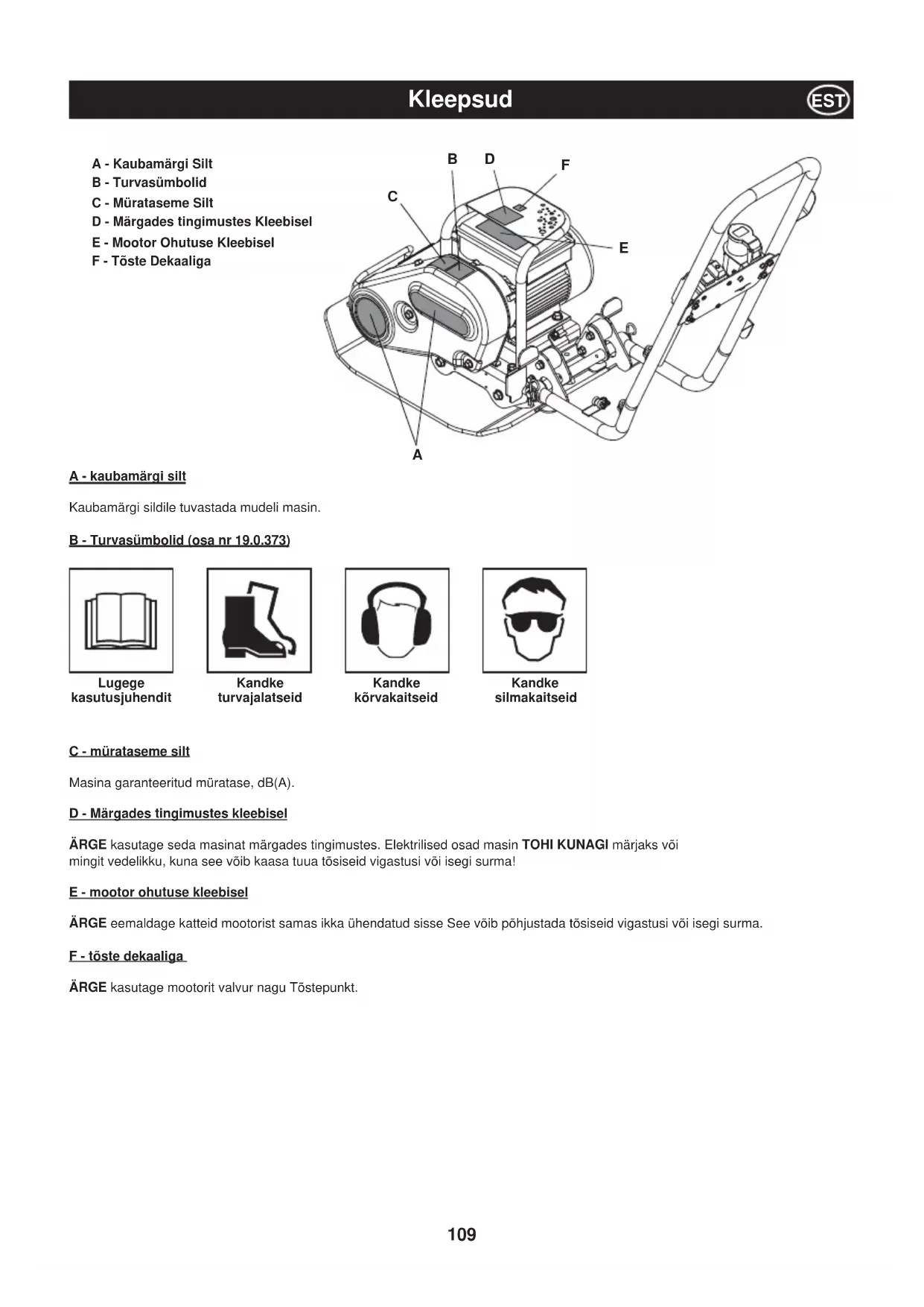 Tehnilised Andmed EST109 A - kaubamärgi silt Kaubamärgi sildile tuvastada mudeli masin. B - Turvasümbolid (osa nr 19.0.373) Lugege kasutusjuhendit Kandke turvajalatseid Kandke kõrvakaitseid Kandke silmakaitseid C - mürataseme silt Masina garanteeritud müratase, dB(A). D - Märgades tingimustes kleebisel ÄRGE kasutage seda masinat märgades tingimustes. Elektrilised osad masin TOHI KUNAGI märjaks või mingit vedelikku, kuna see võib kaasa tuua tõsiseid vigastusi või isegi surma! E - mootor ohutuse kleebisel ÄRGE eemaldage katteid mootorist samas ikka ühendatud sisse See võib põhjustada tõsiseid vigastusi või isegi surma. F - tõste dekaaliga ÄRGE kasutage mootorit valvur nagu Tõstepunkt. A - Kaubamärgi Silt B - Turvasümbolid C - Mürataseme Silt D - Märgades tingimustes Kleebisel E - Mootor Ohutuse Kleebisel F - Tõste Dekaaliga