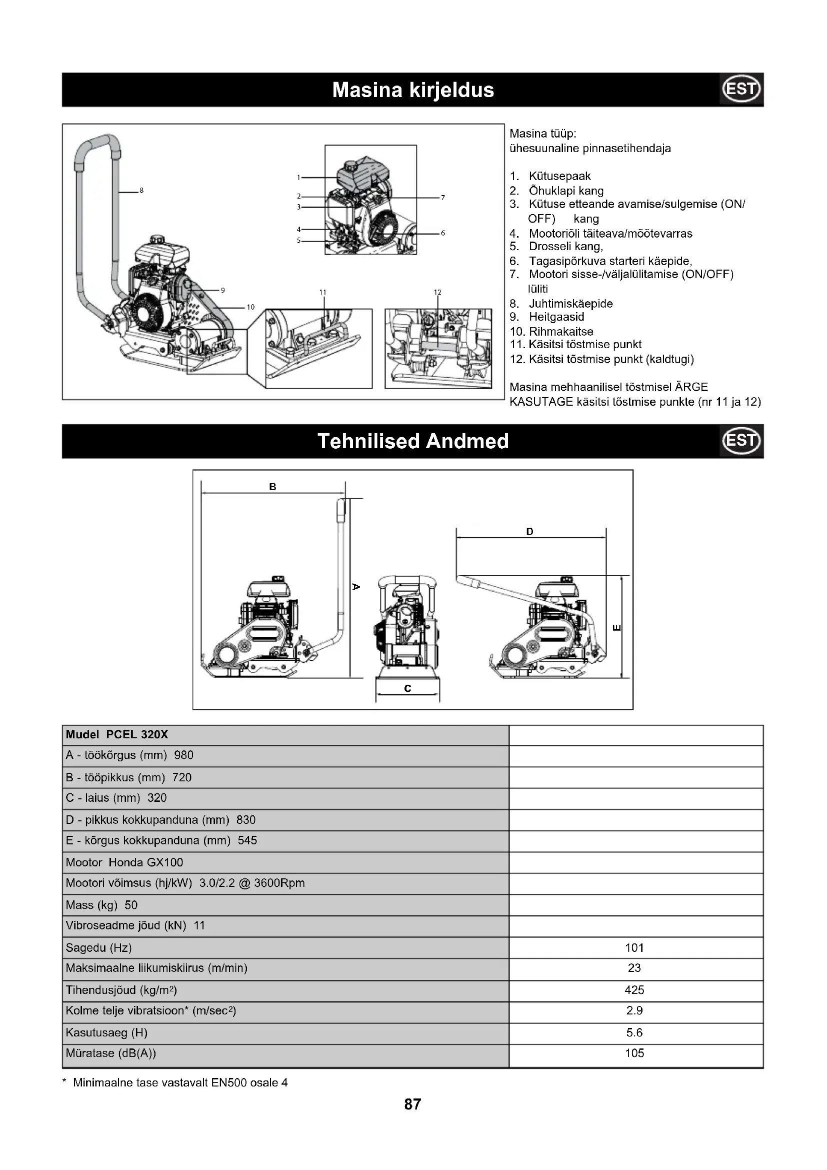 Masina mehhaanilisel tõstmisel ÄRGE KASUTAGE käsitsi tõstmise punkte (nr 11 ja 12) EST Tehnilised Andmed EST Mudel PCEL 320X A - töökõrgus (mm) 980 B - tööpikkus (mm) 720 C - laius (mm) 320 D - pikkus kokkupanduna (mm) 830 E - kõrgus kokkupanduna (mm) 545 Mootor Honda GX100 Mootori võimsus (hj/kW) 3.0/2.2 @ 3600Rpm Mass (kg) 50 Vibroseadme jõud (kN) 11 Sagedu (Hz) 101 Maksimaalne liikumiskiirus (m/min) 23 Tihendusjõud (kg/m