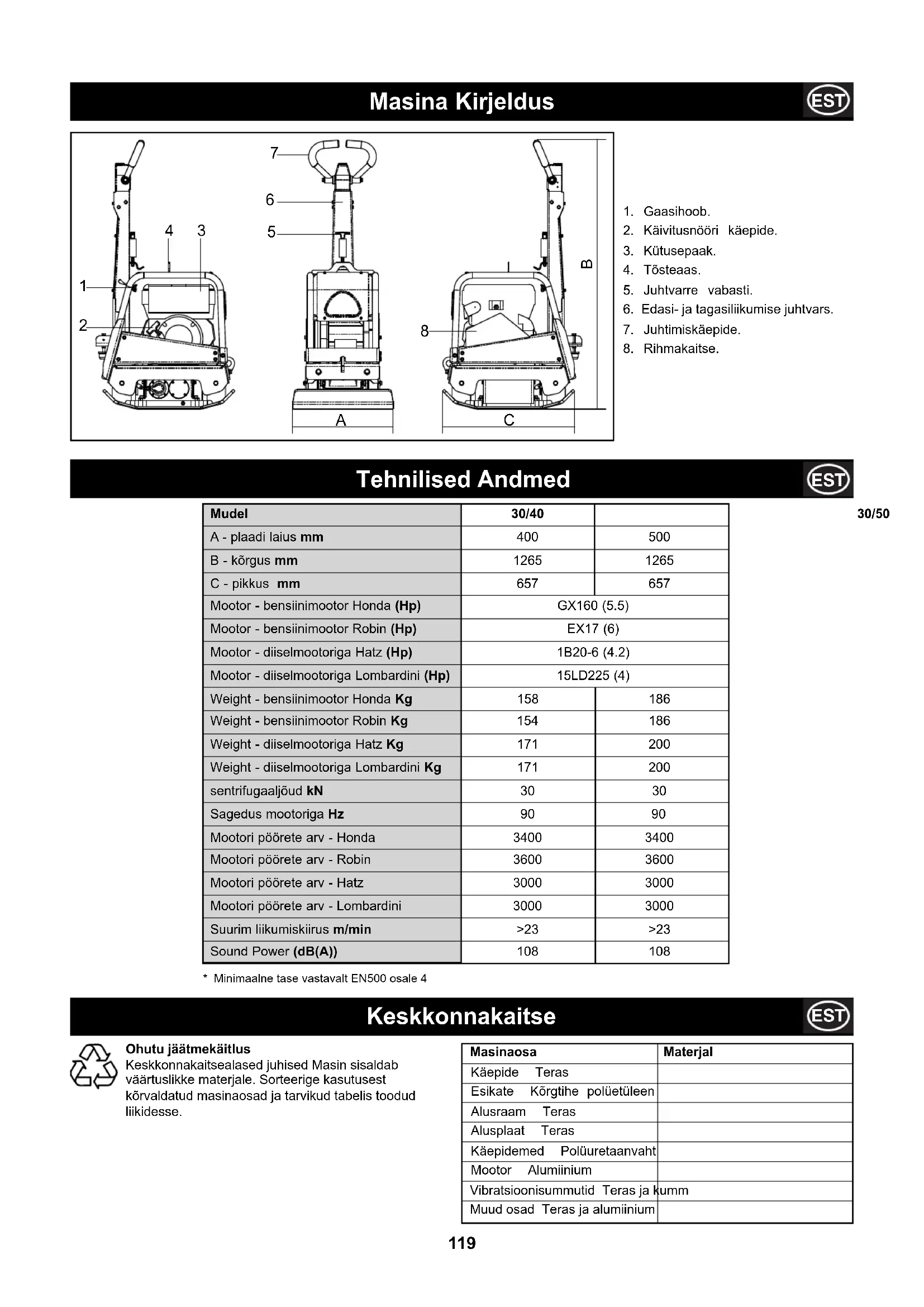 Tehnilised Andmed EST Keskkonnakaitse EST Masinaosa Materjal Käepide Teras Esikate Kõrgtihe polüetüleen Alusraam Teras Alusplaat Teras Käepidemed Polüuretaanvaht Mootor Alumiinium Vibratsioonisummutid Teras ja kumm Muud osad Teras ja alumiinium* Minimaalne tase vastavalt EN500 osale 4Mudel 30/40 30/50 A - plaadi laius mm 400 500 B - kõrgus mm 1265 1265 C - pikkus mm 657 657 Mootor - bensiinimootor Honda (Hp) GX160 (5.5) Mootor - bensiinimootor Robin (Hp) EX17 (6) Mootor - diiselmootoriga Hatz (Hp) 1B20-6 (4.2) Mootor - diiselmootoriga Lombardini (Hp) 15LD225 (4) Weight - bensiinimootor Honda Kg 158 186 Weight - bensiinimootor Robin Kg 154 186 Weight - diiselmootoriga Hatz Kg 171 200 Weight - diiselmootoriga Lombardini Kg 171 200 sentrifugaaljõud kN 30 30 Sagedus mootoriga Hz 90 90 Mootori pöörete arv - Honda 3400 3400 Mootori pöörete arv - Robin 3600 3600 Mootori pöörete arv - Hatz 3000 3000 Mootori pöörete arv - Lombardini 3000 3000 Suurim liikumiskiirus m/min >23 >23 Sound Power (dB(A)) 108 108120 Käivituseelsed Kontrolltoimingud Ohutusjuhised EST Et tagada teie enda ja ümbritsevate inimeste ohutus, lugege palun läbi alltoodud juhised ja veenduge, et olete neist täielikult aru saanud. Masina operaator vastutab täielikult selle eest, et on aru saanud, kuidas seadet ohutult kasutada. Kui te kahtlete masina ohutuses ja nõuetekohases kasutamises, siis konsulteerige oma teenindajaga või Belle Groupiga.