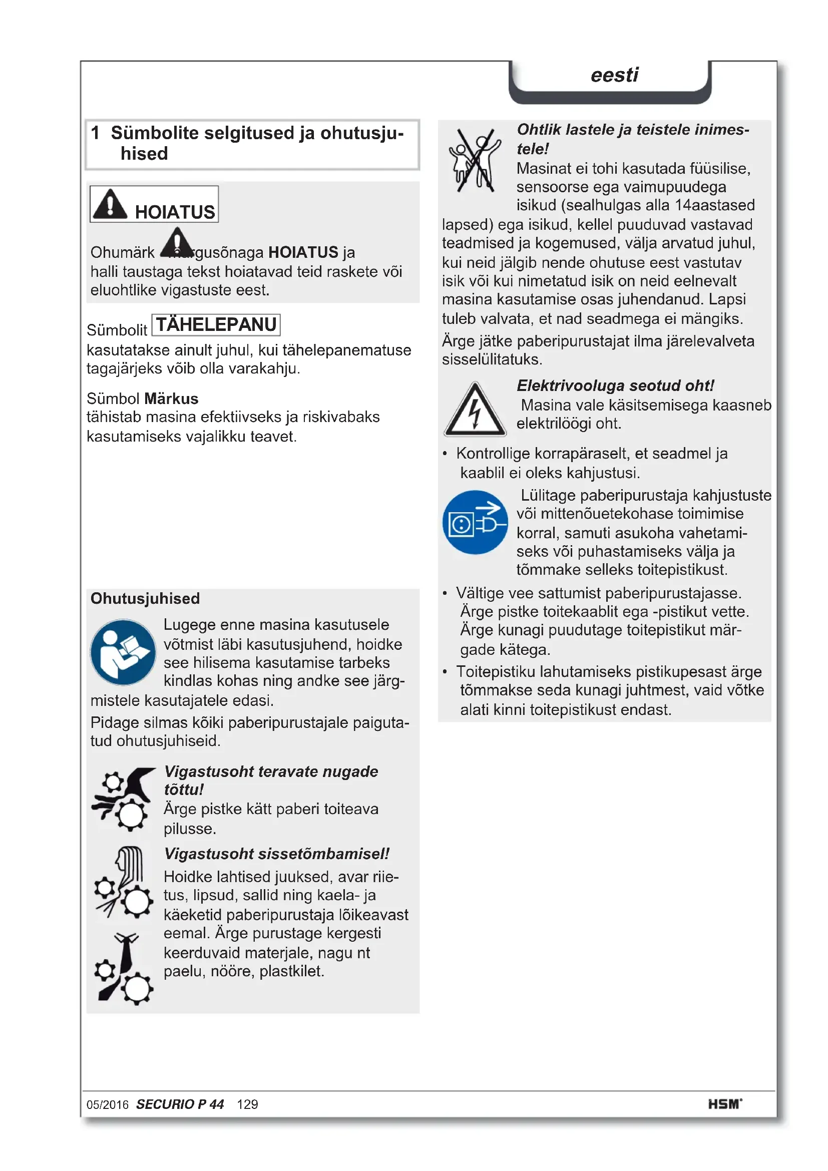 - Max. počet listov (DIN A4, 70 g/m², príp. 80 g/m²), po dĺžke privádzaných, ktoré sa rozrežú pri jednom prechode. Stanovenie uvedených údajov o výkone sa uskutočňuje s novým, naolejovaným rezacím mechanizmom a studeným motorom. Slabšie sieťové napätie alebo iná sieťová frekvencia ako je uvedená môže viesť k nižšiemu výkonu a zvýše- nej hlučnosti. Podľa štruktúry a vlastností papiera a druhu spôsobu uloženia môže byť výkon odlišný.05/2016 SECURIO P 44 129 eesti 1 Sümbolite selgitused ja ohutusju- hised Sümbol Märkus tähistab masina efektiivseks ja riskivabaks kasutamiseks vajalikku teavet. HOIATUS Ohumärk märgusõnaga HOIATUS ja halli taustaga tekst hoiatavad teid raskete või eluohtlike vigastuste eest. Ohutusjuhised Lugege enne masina kasutusele võtmist läbi kasutusjuhend, hoidke see hilisema kasutamise tarbeks kindlas kohas ning andke see järg- mistele kasutajatele edasi. Pidage silmas kõiki paberipurustajale paiguta- tud ohutusjuhiseid. Vigastusoht teravate nugade tõttu! Ärge pistke kätt paberi toiteava pilusse. Vigastusoht sissetõmbamisel! Hoidke lahtised juuksed, avar riie- tus, lipsud, sallid ning kaela- ja käeketid paberipurustaja lõikeavast eemal. Ärge purustage kergesti keerduvaid materjale, nagu nt paelu, nööre, plastkilet. Ohtlik lastele ja teistele inimes- tele! Masinat ei tohi kasutada füüsilise, sensoorse ega vaimupuudega isikud (sealhulgas alla 14aastased lapsed) ega isikud, kellel puuduvad vastavad teadmised ja kogemused, välja arvatud juhul, kui neid jälgib nende ohutuse eest vastutav isik või kui nimetatud isik on neid eelnevalt masina kasutamise osas juhendanud. Lapsi tuleb valvata, et nad seadmega ei mängiks. Ärge jätke paberipurustajat ilma järelevalveta sisselülitatuks. Elektrivooluga seotud oht! Masina vale käsitsemisega kaasneb elektrilöögi oht.