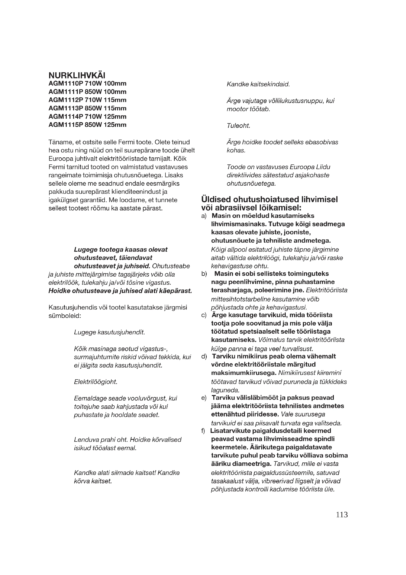 NURKLIHVKÄI AGM1110P 710W 100mm AGM1111P 850W 100mm AGM1112P 710W 115mm AGM1113P 850W 115mm AGM1114P 710W 125mm AGM1115P 850W 125mm Täname, et ostsite selle Fermi toote. Olete teinud hea ostu ning nüüd on teil suurepärane toode ühelt Euroopa juhtivalt elektritööriistade tarnijalt. Kõik Fermi tarnitud tooted on valmistatud vastavuses rangeimate toimimisja ohutusnõuetega. Lisaks sellele oleme me seadnud endale eesmärgiks pakkuda suurepärast klienditeenindust ja igakülgset garantiid. Me loodame, et tunnete sellest tootest rõõmu ka aastate pärast.