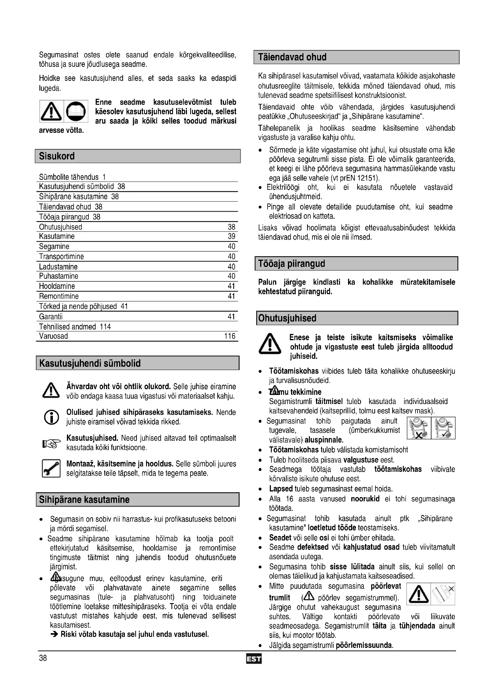 Sisukord Sümbolite tähendus 1 Kasutusjuhendi sümbolid 38 Sihipärane kasutamine 38 Täiendavad ohud 38 Tööaja piirangud 38 Ohutusjuhised 38 Kasutamine 39 Segamine 40 Transportimine 40 Ladustamine 40 Puhastamine 40 Hooldamine 41 Remontimine 41 Tõrked ja nende põhjused 41 Garantii 41 Tehnilised andmed 114 Varuosad 116
