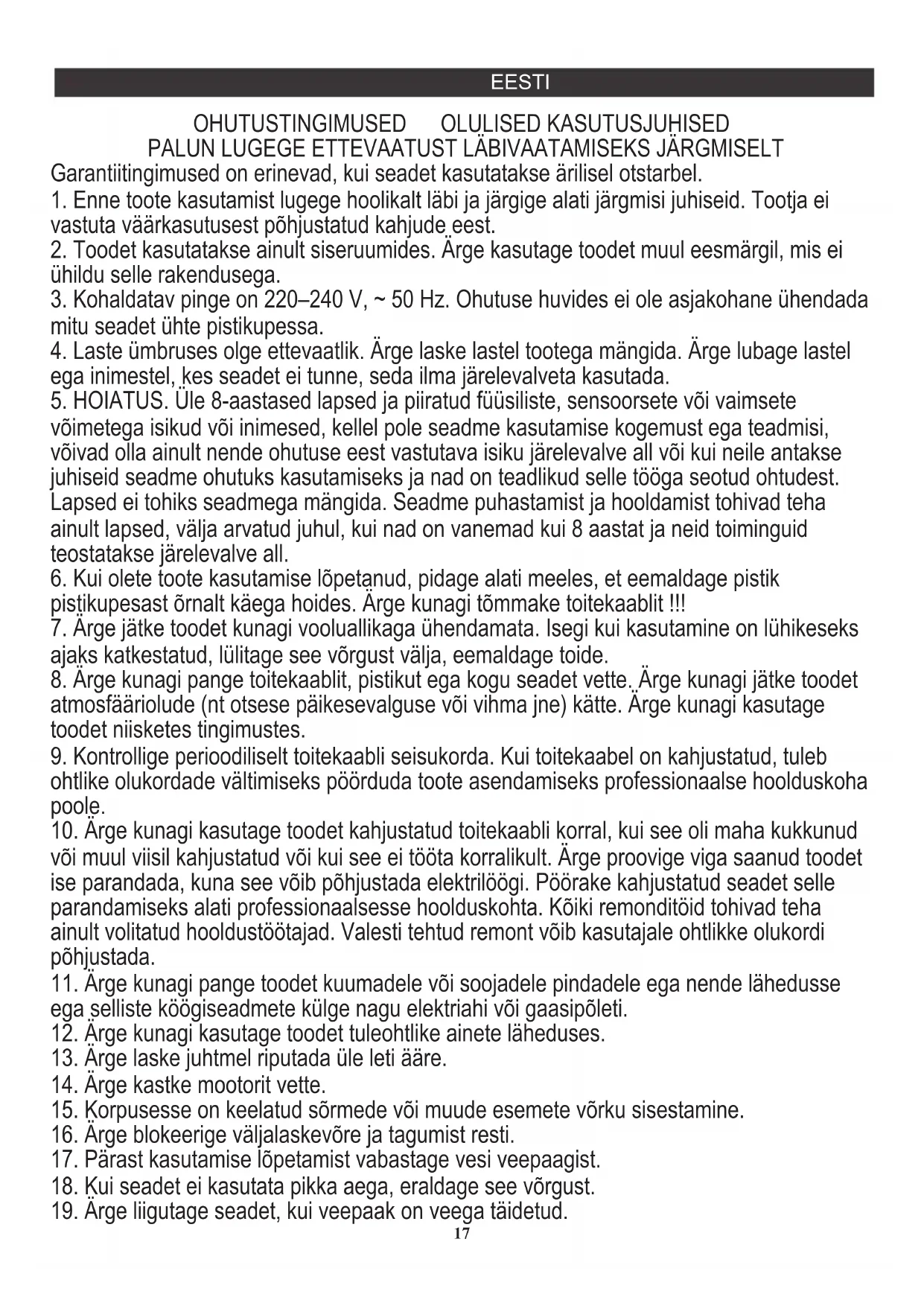 OHUTUSTINGIMUSED OLULISED KASUTUSJUHISED