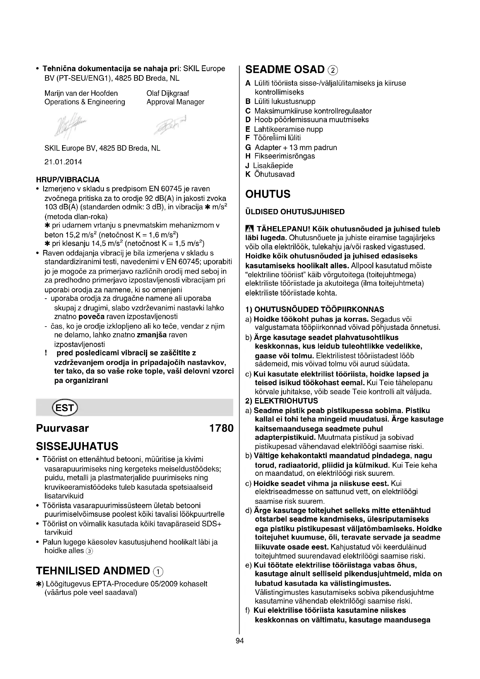 - Kinnitame ainuvastutajana, et punktis “Tehnilised andmed” kirjeldatud toode vastab järgmistele standarditele või normdokumentidele: EN 60745, EN 61000, EN 55014 vastavalt direktiivide 2004/108/EÜ, 2006/42/EÜ, 2011/65/EL