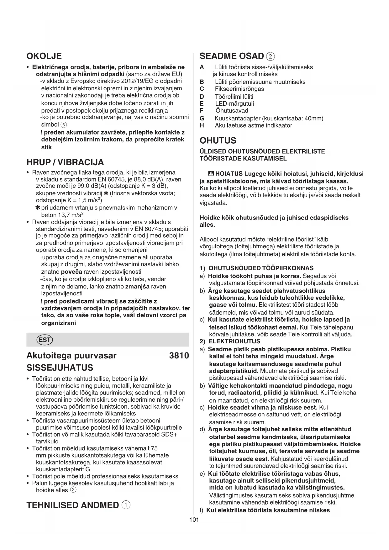 - Standardiga EN 60745 kooskõlas mõõdetud tööriista helirõhu tase on 88,0 dB(A) ja helivõimsuse tase 99,0 dB(A) (määramatus K = 3 dB), ja vibratsioon ✱ (ruumiliste vektorite summa; mõõtemääramatus K = 1,5 m/s²) ✱ betooni vasarapuurimisel 13,7 m/s²