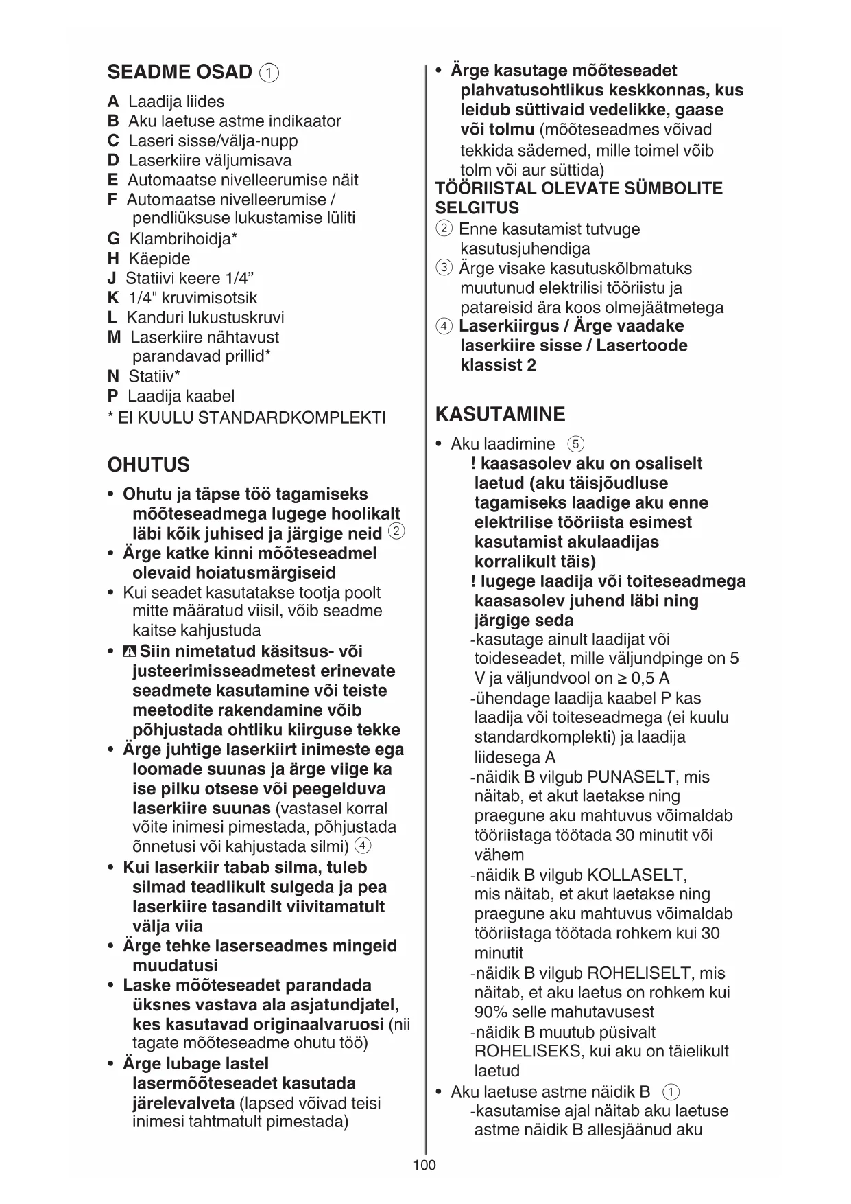 A Laadija liides B Aku laetuse astme indikaator C Laseri sisse/välja-nupp D Laserkiire väljumisava E Automaatse nivelleerumise näit F Automaatse nivelleerumise / pendliüksuse lukustamise lüliti G Klambrihoidja* H Käepide J Statiivi keere 1/4” K 1/4" kruvimisotsik L Kanduri lukustuskruvi M Laserkiire nähtavust parandavad prillid* N Statiiv* P Laadija kaabel
