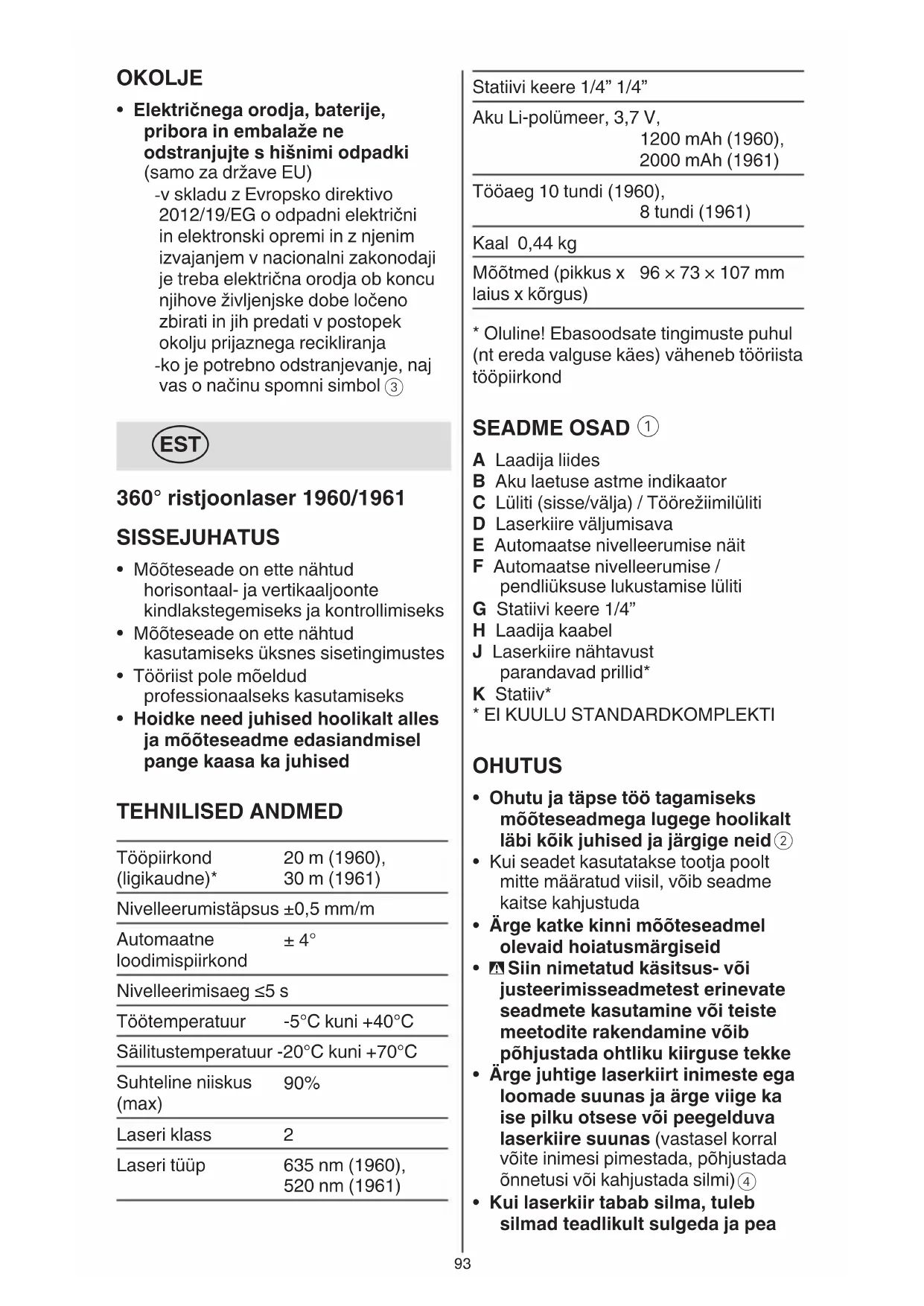 - Hoidke need juhised hoolikalt alles ja mõõteseadme edasiandmisel pange kaasa ka juhised TEHNILISED ANDMED Tööpiirkond (ligikaudne)* 20 m (1960), 30 m (1961) Nivelleerumistäpsus ±0,5 mm/m Automaatne loodimispiirkond ± 4° Nivelleerimisaeg ≤5 s Töötemperatuur -5°C kuni +40°C Säilitustemperatuur -20°C kuni +70°C Suhteline niiskus (max) 90% Laseri klass 2 Laseri tüüp 635 nm (1960), 520 nm (1961)94 praegune aku mahtuvus võimaldab tööriistaga töötada rohkem kui 30 minutit - näidik B vilgub ROHELISELT, mis näitab, et aku laetus on rohkem kui 90% selle mahutavusest - näidik B muutub püsivalt ROHELISEKS, kui aku on täielikult laetud