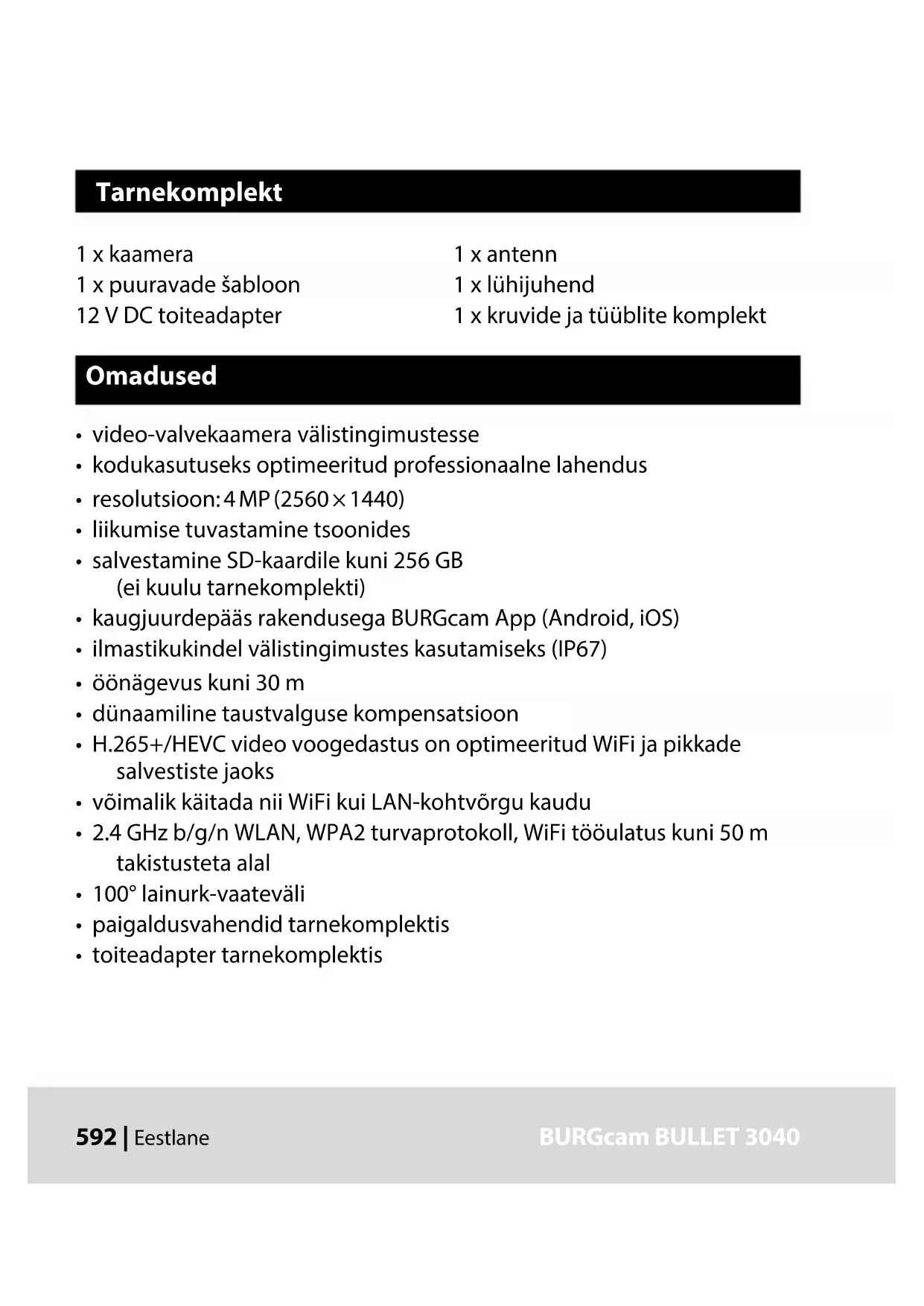 Üksikasjalikud selgitused menüüpunktide kohta leiate kasutaja käsiraamatust. Kaamera tüüp WiFi-infrapuna-torukaamera sise- ja välistingimustesse Sensor 1/3” 4 MP Progressive Scan CMOS Resolutsioon 4 MP: 2560 x 1440 1080 p: 1920 x 1080 (= Full HD) 720 p: 1280 x 720 D1: 704 x 576 / 704 x 480 CIF: 352 x 288 / 352 x 240 Tehnilised andmed610 | Eestlane BURGcam BULLET 3040 BURGcam BULLET 3040 Eestlane | 611 Kaadrisagedus 20 fps @ 4 MP, 25 / 30 fps @ 1080 p Infrapunalambid Tööulatus kuni 30 m* Infrapunalter Mehaaniline Objektiiv 2,8 mm F2.0 püsifookusega objektiiv Vaatenurk Horisontaalselt: 100° Valge tasakaalustus Automaatne WLAN IEEE802.11b / g / n; kuni 50 m (takistusteta alal) LAN (RJ-45) 10 / 100 Base-T Toetatavad protokollid IPv4 / IPv6, HTTP, HTTPS, TCP / IP, UDP, UPnP, RTSP, RTP, SMTP, NTP, DHCP, DNS, DDNS, FTP, IP Filter Micro-SD-kaart Max 256 GB, salvestiste ja hetktõmmiste jaoks Paigaldamine Kaasas kandur seinale või lakke paigaldamiseks Elektritoide 12 V DC, toiteadapter tarnekomplektis Võimsustarve < 4,8 W Temperatuurivahemik -30 °C kuni +50 °C612 | Eestlane BURGcam BULLET 3040 Kaitseklass IP67 Mõõtmed Ø 70 x 165 mm Kaal 0,45 kg Lisafunktsioonid: Taustvalguse kompensatsioon