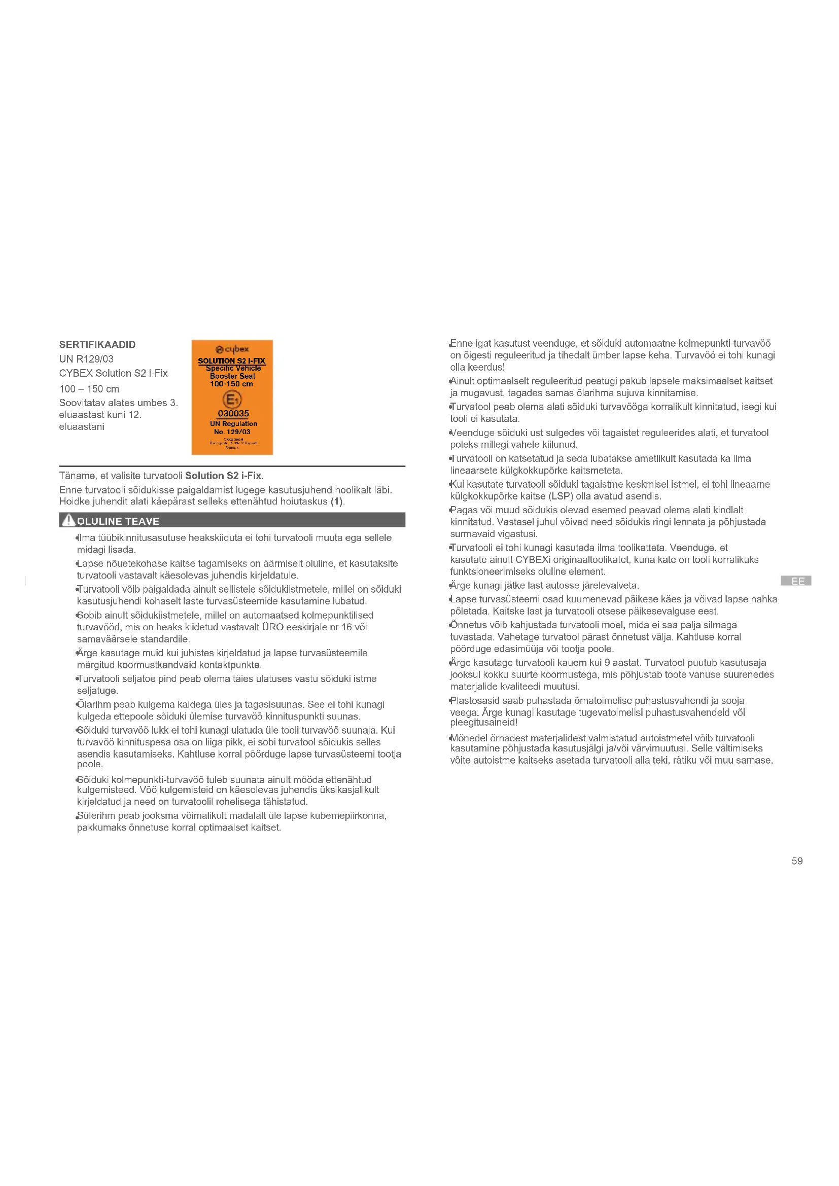 Katet võib pesta ainult temperatuuril 30 °C õrna pesuprogrammiga, vastasel juhul võib kattekanga värv muutuda. Peske katet muust pesust eraldi ja ärge kuivatage seda kuivatis või otsese päikesevalguse käes! TOOTJA GARANTII JA KASUTUSEST KÕRVALDAMISE REEGLID CYBEX GmbH (Riedingerstr. 18, 95448 Bayreuth, Saksamaa) annab sellele tootele 3-aastase garantii. Garantii kehtib riigis, kus jaemüüja toote algselt kliendile müüs. Garantii sisu ja kogu garantii jõustamiseks vajalik teave on leitav meie kodulehelt go.cybex-online.com/manufacturer-warranty-car-seats. Kui tootekirjelduses on näidatud garantii, ei mõjuta see seaduslikke õigusi, mis teil on meie suhtes defektide osas. Palume teil järgida oma asukohariigi jäätmete kõrvaldamise eeskirju.62