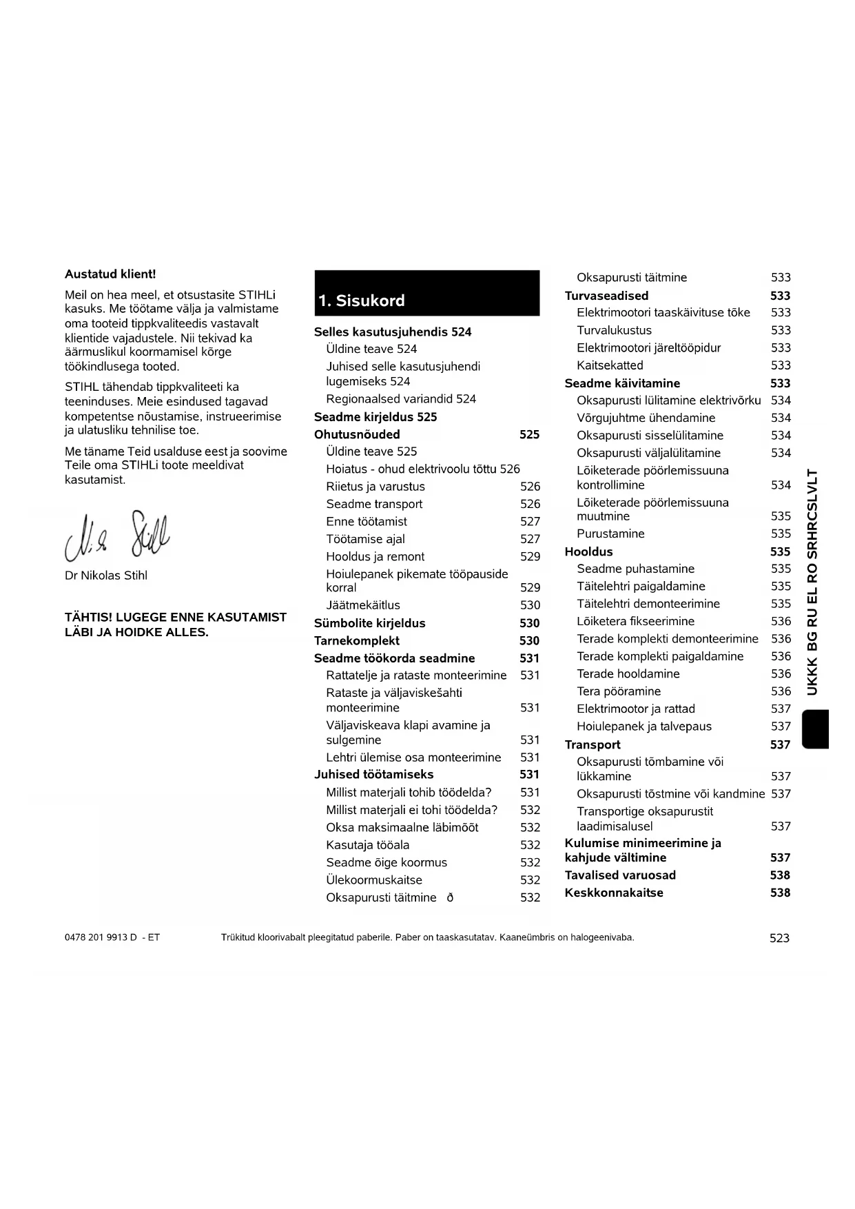 Austatud klient! Meil on hea meel, et otsustasite STIHLi kasuks. Me töötame välja ja valmistame oma tooteid tippkvaliteedis vastavalt klientide vajadustele. Nii tekivad ka äärmuslikul koormamisel kõrge töökindlusega tooted. STIHL tähendab tippkvaliteeti ka teeninduses. Meie esindused tagavad kompetentse nõustamise, instrueerimise ja ulatusliku tehnilise toe. Me täname Teid usalduse eest ja soovime Teile oma STIHLi toote meeldivat kasutamist. Dr Nikolas Stihl
