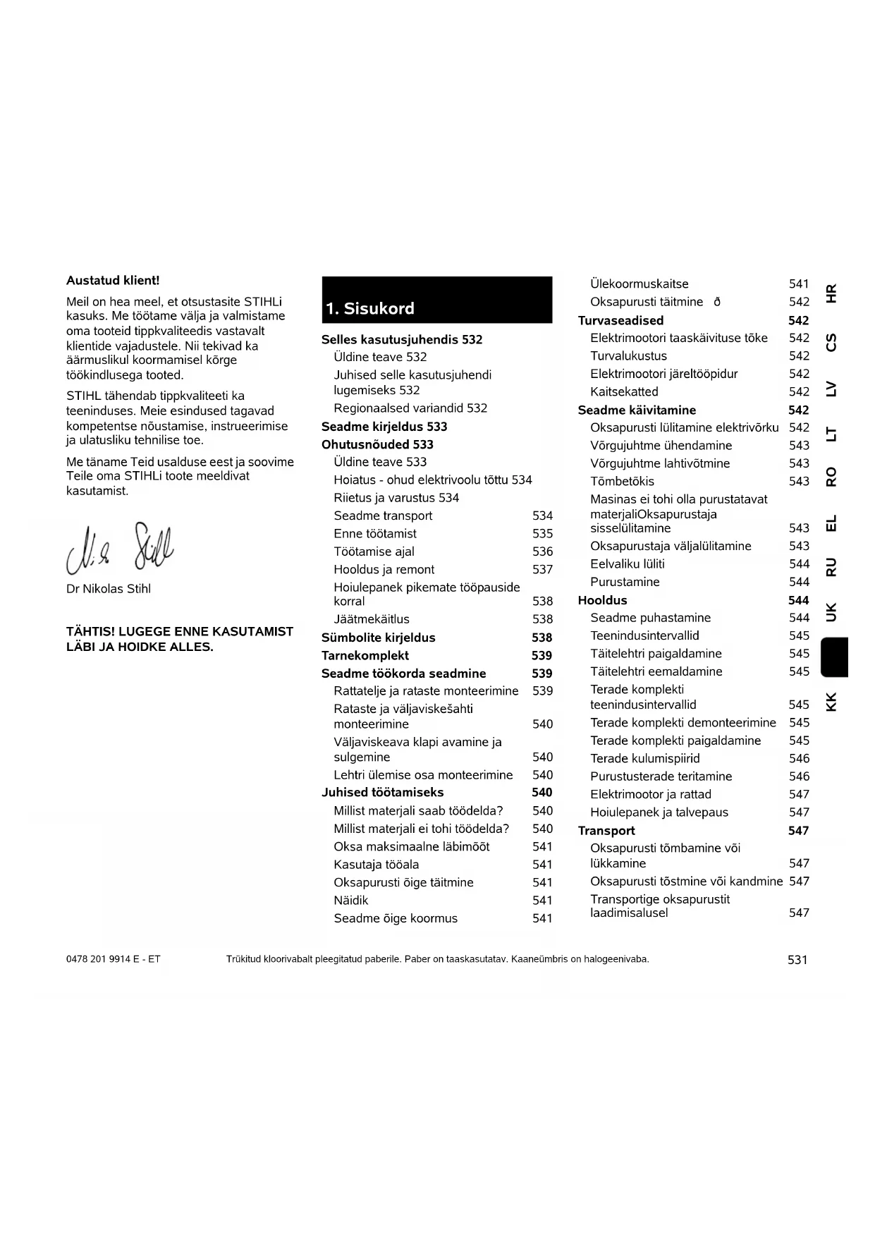 Austatud klient! Meil on hea meel, et otsustasite STIHLi kasuks. Me töötame välja ja valmistame oma tooteid tippkvaliteedis vastavalt klientide vajadustele. Nii tekivad ka äärmuslikul koormamisel kõrge töökindlusega tooted. STIHL tähendab tippkvaliteeti ka teeninduses. Meie esindused tagavad kompetentse nõustamise, instrueerimise ja ulatusliku tehnilise toe. Me täname Teid usalduse eest ja soovime Teile oma STIHLi toote meeldivat kasutamist. Dr Nikolas Stihl