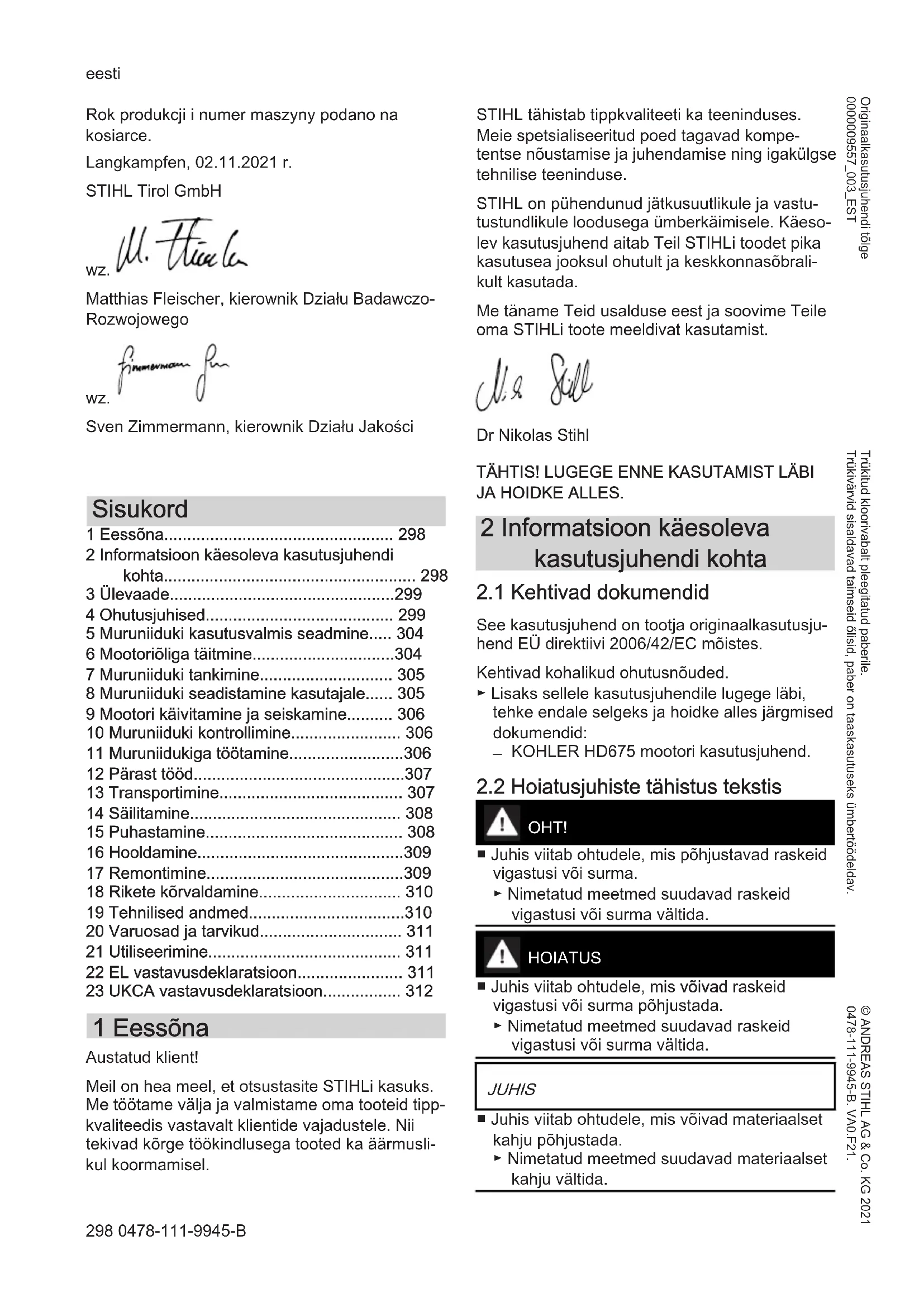 STIHL on puhendunud jatkusuutilikule ja vastutustundlikule loodusega umberkämisele. Käesolev kasutusjuhend aitab Teil STIHLi toodet pika kasutusea jooksul ohutult ja keskkonnasobralikult kasutada.