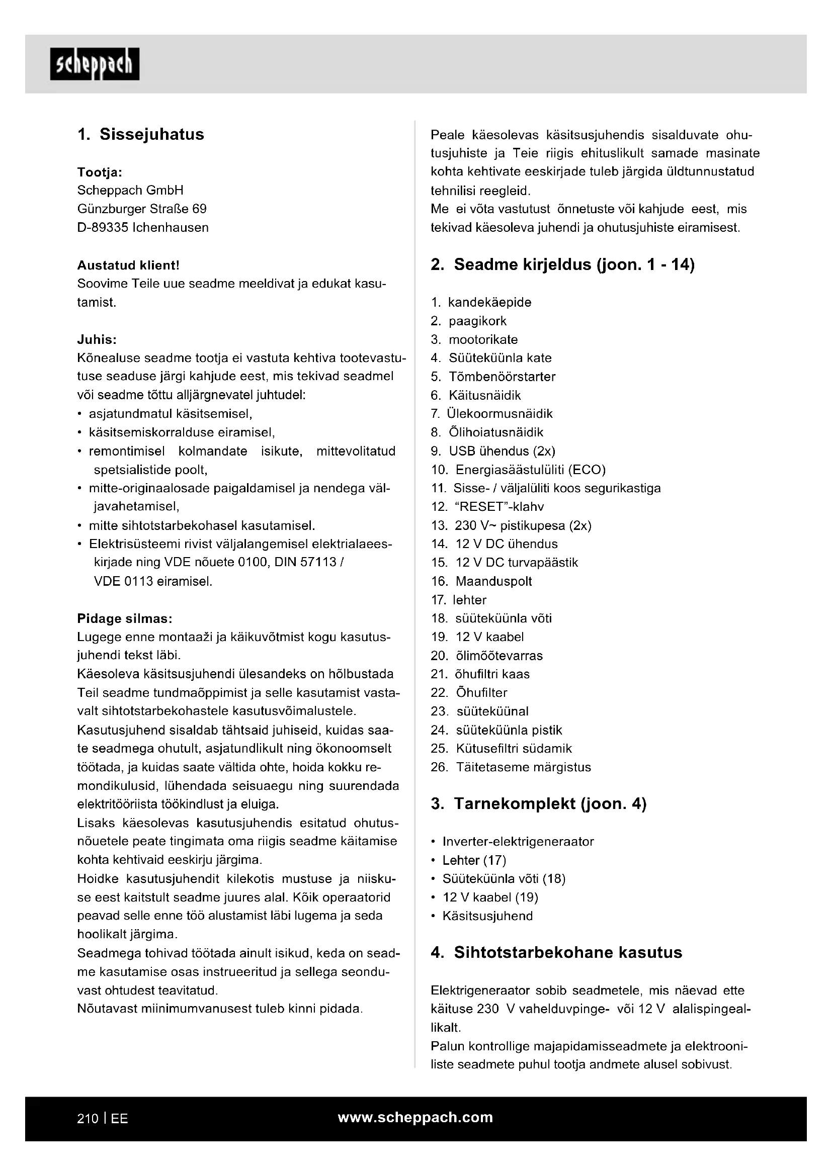 - Elektrisüsteemi rivist väljalangemisel elektrialaees- kirjade ning VDE nõuete 0100, DIN 57113 / VDE 0113 eiramisel. Pidage silmas: Lugege enne montaaži ja käikuvõtmist kogu kasutus- juhendi tekst läbi. Käesoleva käsitsusjuhendi ülesandeks on hõlbustada Teil seadme tundmaõppimist ja selle kasutamist vasta- valt sihtotstarbekohastele kasutusvõimalustele. Kasutusjuhend sisaldab tähtsaid juhiseid, kuidas saa- te seadmega ohutult, asjatundlikult ning ökonoomselt töötada, ja kuidas saate vältida ohte, hoida kokku re- mondikulusid, lühendada seisuaegu ning suurendada elektritööriista töökindlust ja eluiga. Lisaks käesolevas kasutusjuhendis esitatud ohutus- nõuetele peate tingimata oma riigis seadme käitamise kohta kehtivaid eeskirju järgima. Hoidke kasutusjuhendit kilekotis mustuse ja niisku- se eest kaitstult seadme juures alal. Kõik operaatorid peavad selle enne töö alustamist läbi lugema ja seda hoolikalt järgima. Seadmega tohivad töötada ainult isikud, keda on sead- me kasutamise osas instrueeritud ja sellega seondu- vast ohtudest teavitatud. Nõutavast miinimumvanusest tuleb kinni pidada.www.scheppach.com