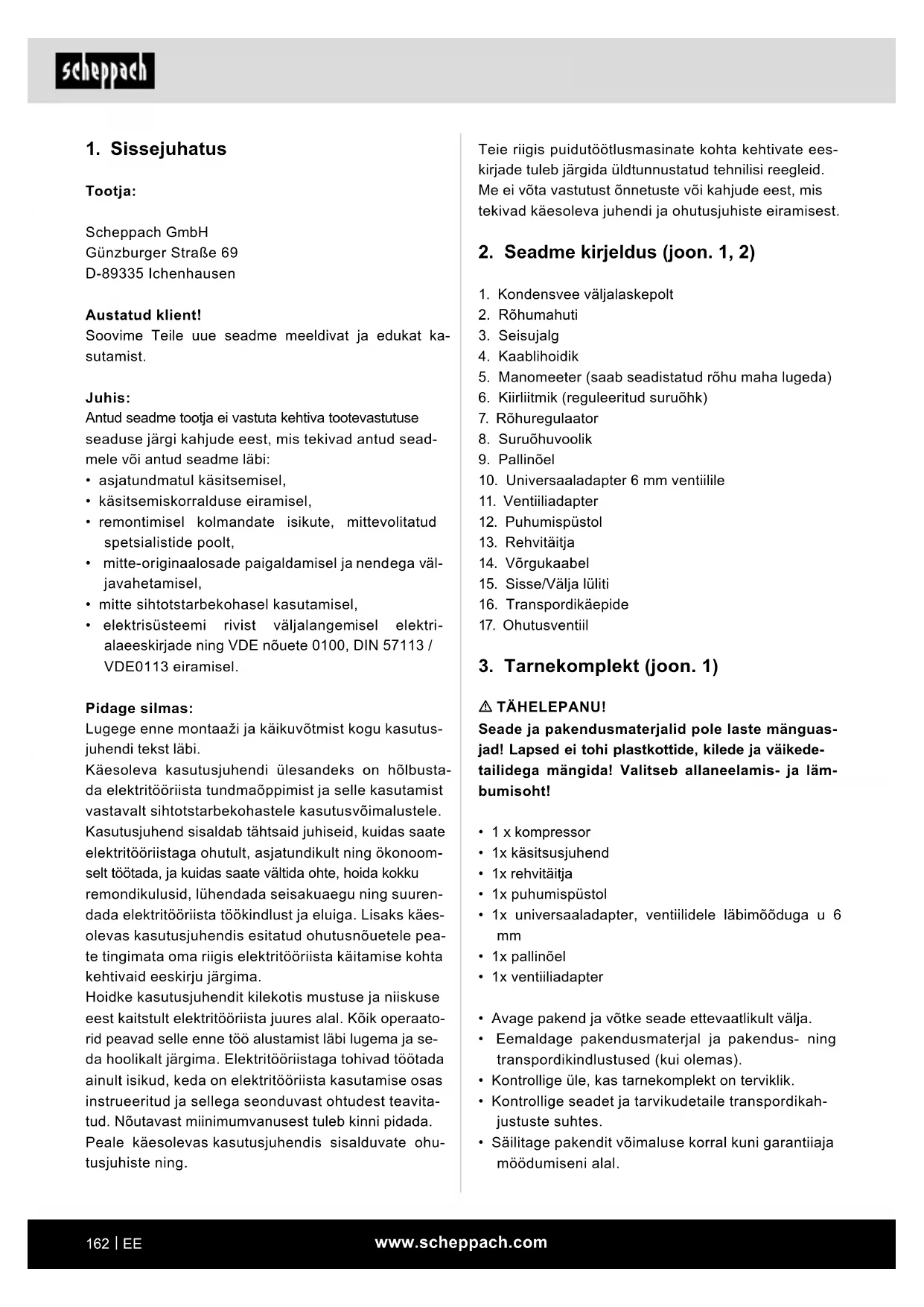 Tootja: Scheppach GmbH Günzburger Straße 69 D-89335 Ichenhausen Austatud klient! Soovime Teile uue seadme meeldivat ja edukat ka- sutamist. Juhis: Antud seadme tootja ei vastuta kehtiva tootevastutuse seaduse järgi kahjude eest, mis tekivad antud sead- mele või antud seadme läbi: