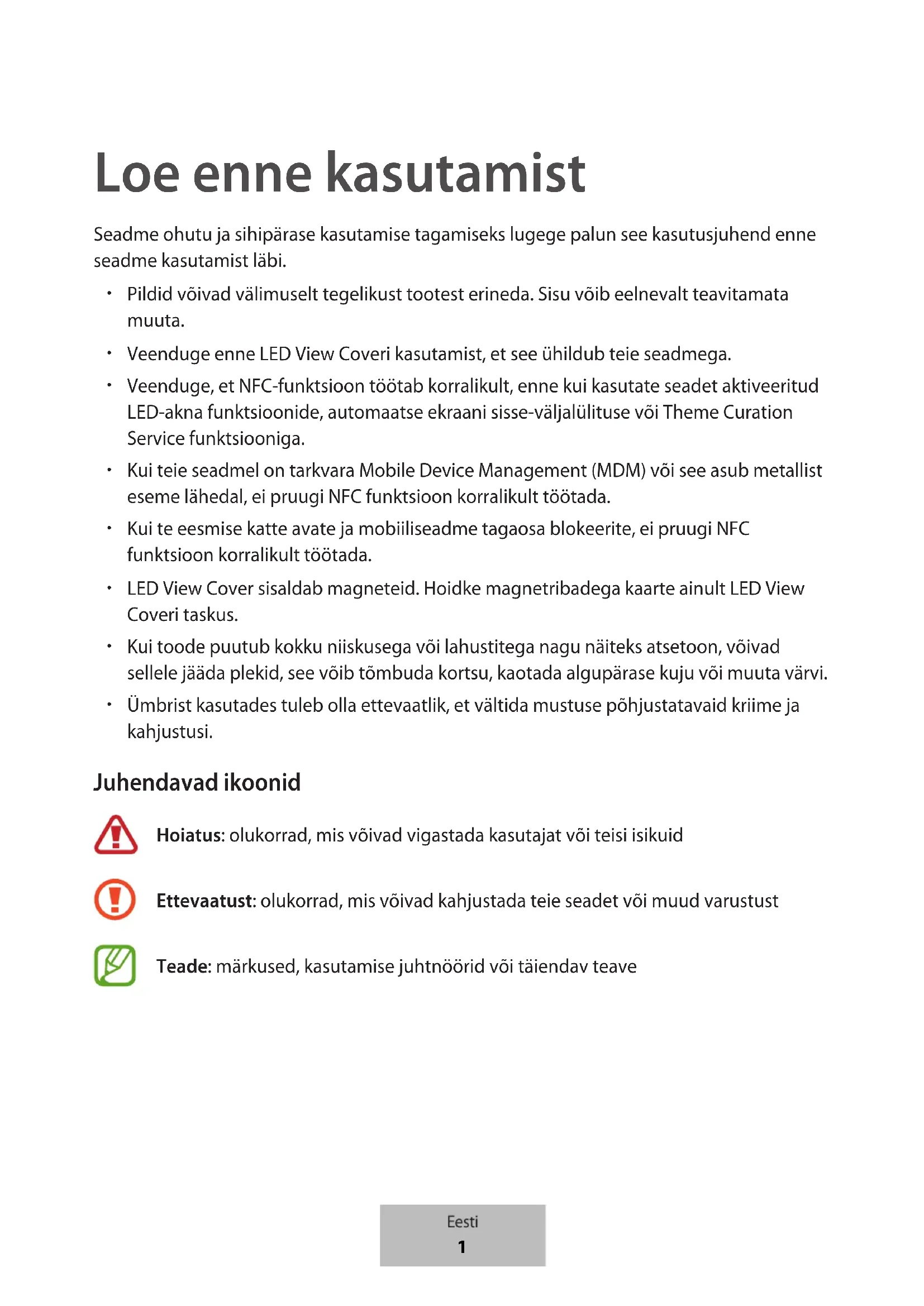 Ümbrist kasutades tuleb olla ettevaatlik, et vältida mustuse põhjustatavaid kriime ja kahjustusi. Juhendavad ikoonid Hoiatus: olukorrad, mis võivad vigastada kasutajat või teisi isikuid Ettevaatust: olukorrad, mis võivad kahjustada teie seadet või muud varustust Teade: märkused, kasutamise juhtnöörid või täiendav teave Eesti