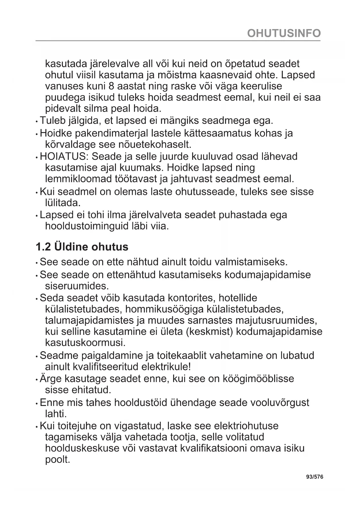 - Vähemalt 8-aastased ja vanemad lapsed ning piiratud füüsiliste, sensoorsete või vaimsete võimete või väheste kogemuste ja teadmistega isikud tohivad seda seadet 92/576 OHUTUSINFOkasutada järelevalve all või kui neid on õpetatud seadet ohutul viisil kasutama ja mõistma kaasnevaid ohte. Lapsed vanuses kuni 8 aastat ning raske või väga keerulise puudega isikud tuleks hoida seadmest eemal, kui neil ei saa pidevalt silma peal hoida.