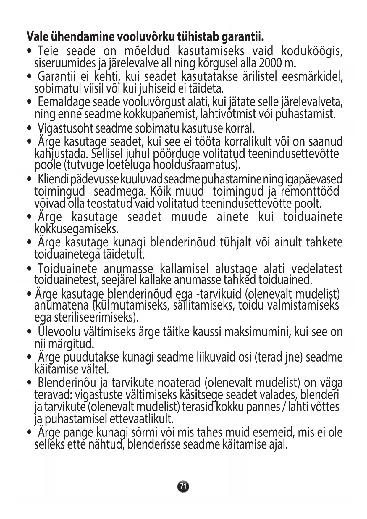 - Ärge pange kunagi sõrmi või mis tahes muid esemeid, mis ei ole selleks ette nähtud, blenderisse seadme käitamise ajal.72