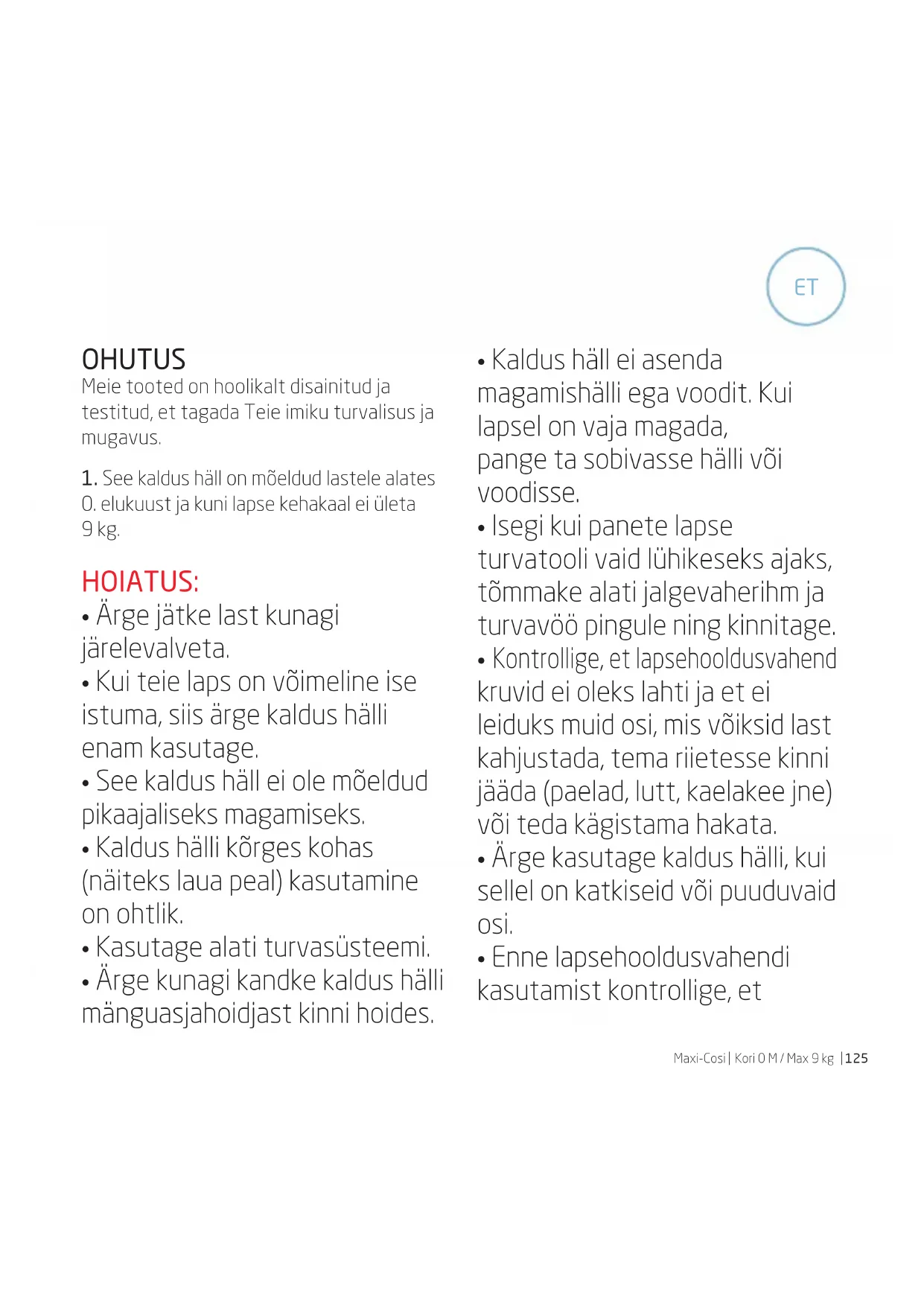 Maxi-Cosi järgida käesolevas kasutusjuhendis toodud juhiseid, teise tootega kasutamisest tekkinud kahjustused, selliste teenusepakkujate teenuste kasutamisest tekkinud kahjustused, kes ei ole meie poolt volitatud, või toote varastamise korral, kui mis tahes märgis või identifitseerimisnumber on tootelt eemaldatud või seda on muudetud. Normaalse kulumise alla kuulub rataste ja kanga kulumine tavakasutusel ning värvide ja materjalide loomulik kulumine pikaaegsel kasutamisel. Mida teha defektide korral: Probleemide või defektide ilmnemisel on kiire teeninduse saamiseks parim lahendus külastada teie volitatud turustajat või jaemüüjat. Nemad (1) aktsepteerivad meie 24-kuulist garantiid. Peate esitama ostudokumendi, mis on väljastatud kuni 24 kuud enne garantiiteenuse taotlemist. Kõige lihtsam on, kui kiidame teie garantiiteenuse taotluse eelnevalt heaks. Kui esitate garantiiperioodi ajal taotluse, võime paluda teil toote kooskõlas meie juhistega volitatud turustaja või jaemüüja juurde toimetada. Meie tasume toote transpordi- ja tagastamiskulud, kui olete juhiseid järginud. Kahjustused ja/ või defektid, millele meie garantii ega kliendi seaduslikud õigused ei laiene, ja/ või toodete kahjustused ja/või defektid, mida meie garantii ei kata, saab kõrvaldada mõistliku tasu eest. Kliendi õigused: Kliendil on seaduslikud õigused kooskõlas tarbijakaitseseadustega, mis võivad riigiti erineda. Kliendi õigusi, mis on kooskõlas kehtivate riiklikke seadustega, see garantii ei mõjuta. (1) Jaemüüjatelt või edasimüüjatelt ostetud tooteid, mille sildid või identifitseerimisnumbrid on eemaldatud või muudetud, ei aktsepteerita. Samuti ei aktsepteerita volitamata jaemüüjatelt ostetud tooteid. Nendele toodetele garantii ei laiene, kuna nende autentsust ei ole võimalik tuvastada.