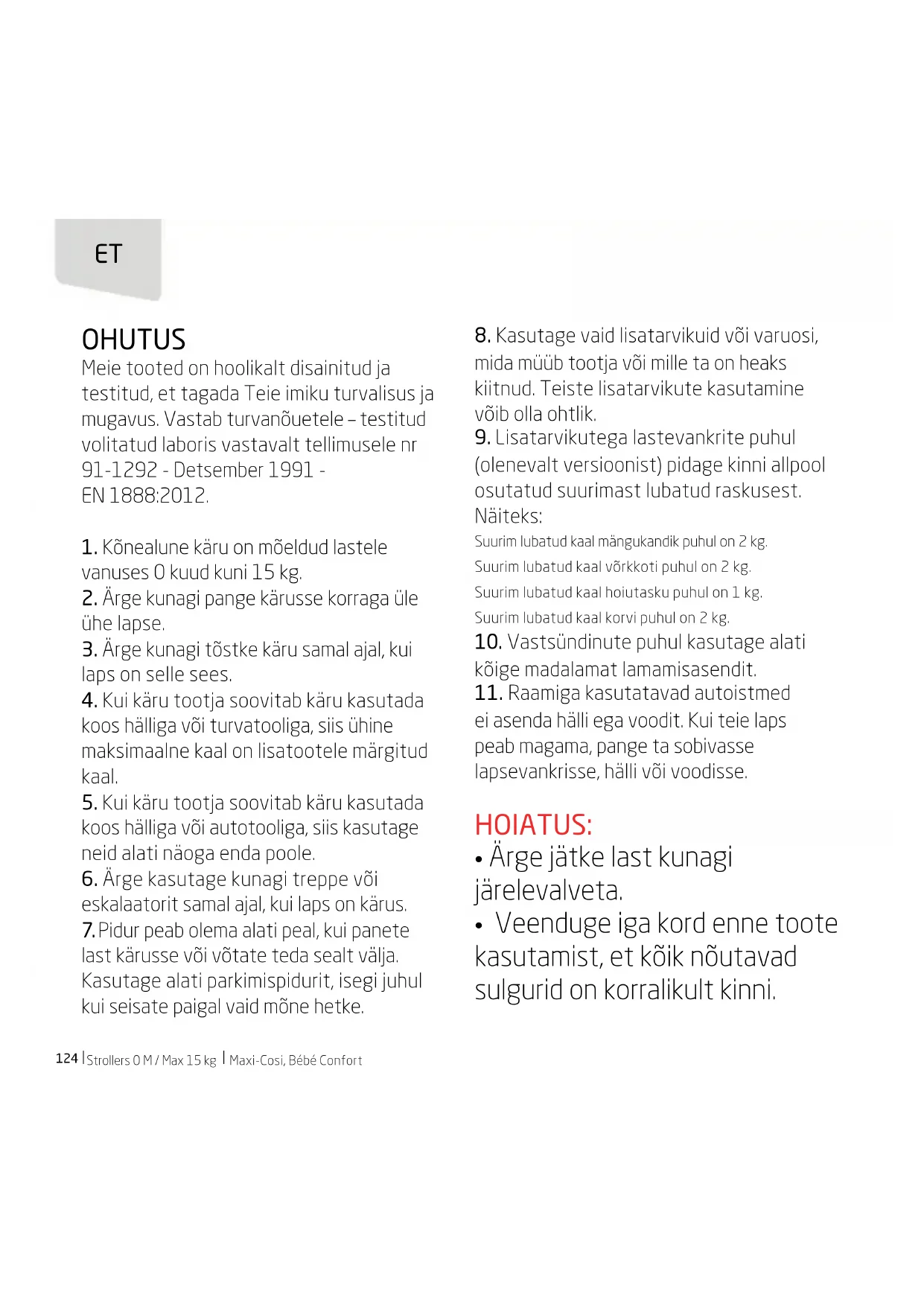 OHUTUS Meie tooted on hoolikalt disainitud ja testitud, et tagada Teie imiku turvalisus ja mugavus. Vastab turvanõuetele – testitud volitatud laboris vastavalt tellimusele nr 91-1292 - Detsember 1991 - EN 1888:2012.
