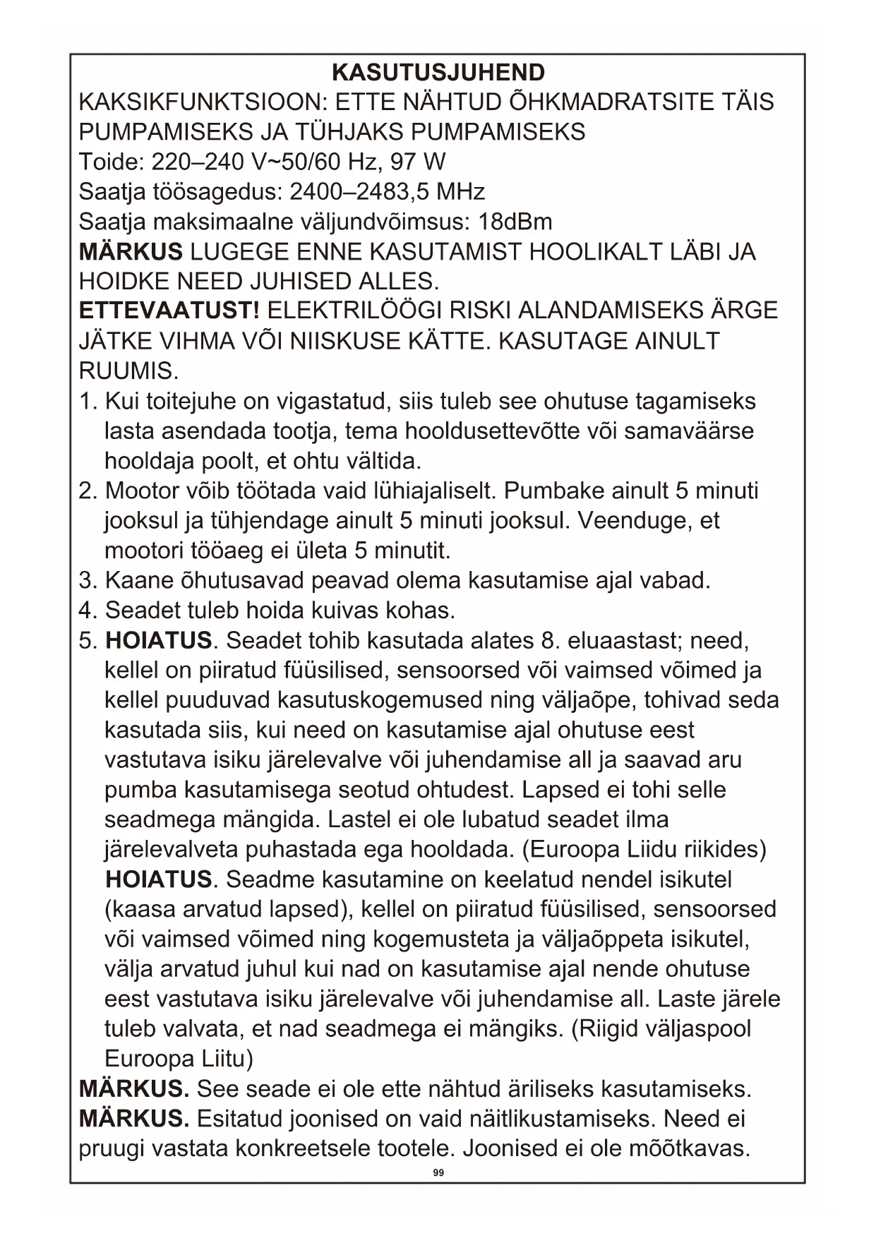 kellel on piiratud füüsilised, sensoorsed või vaimsed võimed ja kellel puuduvad kasutuskogemused ning väljaõpe, tohivad seda kasutada siis, kui need on kasutamise ajal ohutuse eest vastutava isiku järelevalve või juhendamise all ja saavad aru pumba kasutamisega seotud ohtudest. Lapsed ei tohi selle seadmega mängida. Lastel ei ole lubatud seadet ilma järelevalveta puhastada ega hooldada. (Euroopa Liidu riikides) HOIATUS. Seadme kasutamine on keelatud nendel isikutel (kaasa arvatud lapsed), kellel on piiratud füüsilised, sensoorsed või vaimsed võimed ning kogemusteta ja väljaõppeta isikutel, välja arvatud juhul kui nad on kasutamise ajal nende ohutuse eest vastutava isiku järelevalve või juhendamise all. Laste järele tuleb valvata, et nad seadmega ei mängiks. (Riigid väljaspool Euroopa Liitu) MÄRKUS. See seade ei ole ette nähtud äriliseks kasutamiseks. MÄRKUS. Esitatud joonised on vaid näitlikustamiseks. Need ei pruugi vastata konkreetsele tootele. Joonised ei ole mõõtkavas.100 Pumba kasutusjuhised: