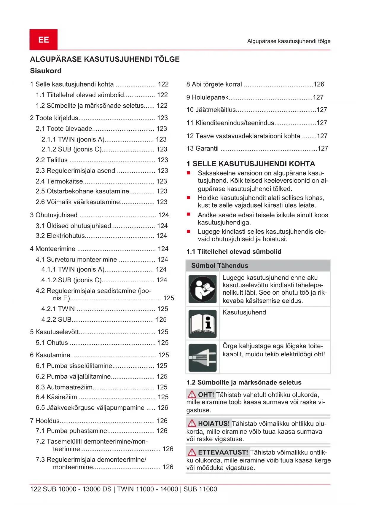 liiva sisaldav vesi ja abrasiivsed vedelikud 3 OHUTUSJUHISED OHT! Oht pinget juhtivate osade puudu- tamisel! Pumba või pikenduskaabli defekt võib tekitada raskeid vigastusi!