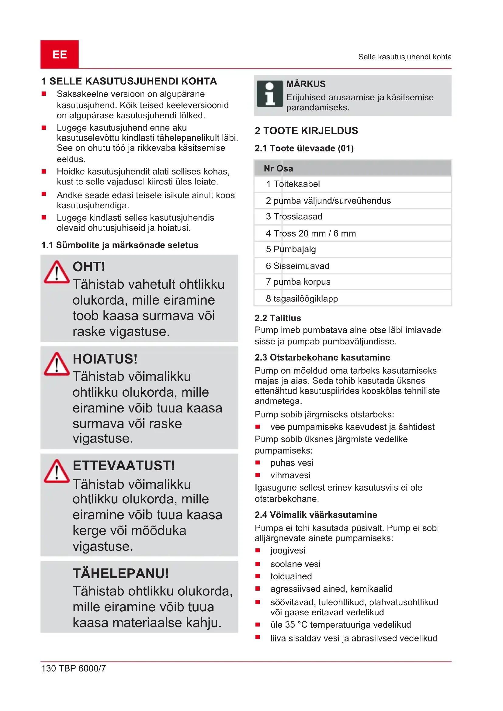 Pumpa ja pikenduskaablit tohib kasutad üksnes tehniliselt laitmatus seisukorras! Kahjustunud pumpasid ei tohi kasutada.