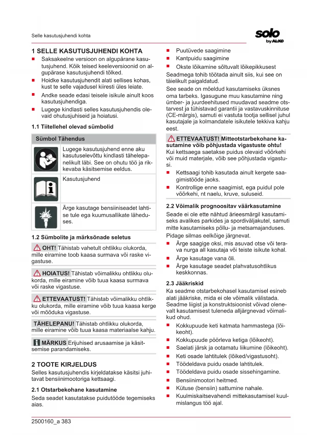 OHT! Tähistab vahetult ohtlikku olukorda, mille eiramine toob kaasa surmava või raske vi- gastuse. HOIATUS! Tähistab võimalikku ohtlikku olu- korda, mille eiramine võib tuua kaasa surmava või raske vigastuse. ETTEVAATUST! Tähistab võimalikku ohtlik- ku olukorda, mille eiramine võib tuua kaasa kerge või mõõduka vigastuse. TÄHELEPANU! Tähistab ohtlikku olukorda, mille eiramine võib tuua kaasa materiaalse kahju. MÄRKUS Erijuhised arusaamise ja käsit- semise parandamiseks. 2 TOOTE KIRJELDUS Selles kasutusjuhendis kirjeldatakse käsitsi juhi- tavat bensiinimootoriga kettsaagi.