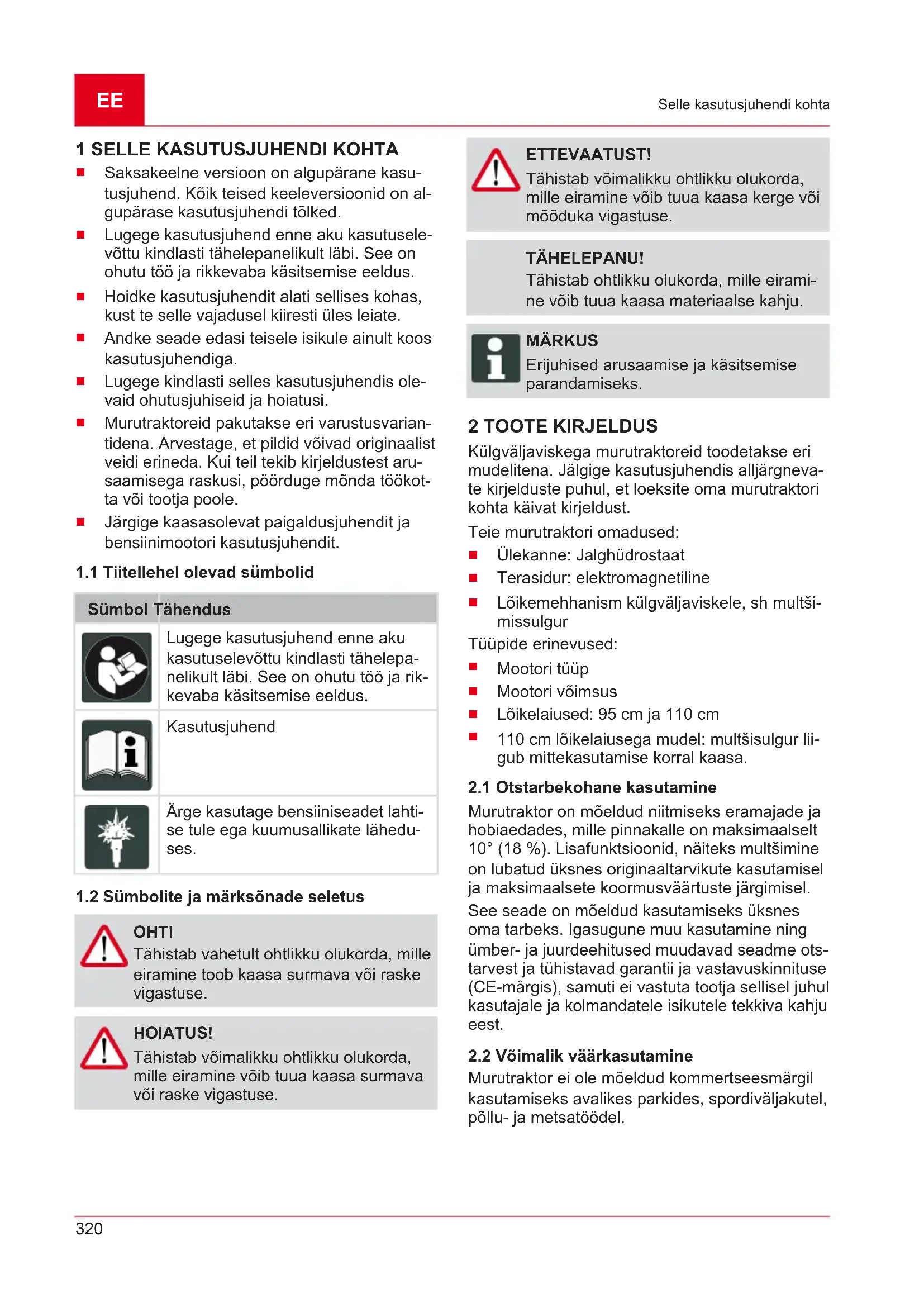 OHT! Tähistab vahetult ohtlikku olukorda, mille eiramine toob kaasa surmava või raske vigastuse. HOIATUS! Tähistab võimalikku ohtlikku olukorda, mille eiramine võib tuua kaasa surmava või raske vigastuse. ETTEVAATUST! Tähistab võimalikku ohtlikku olukorda, mille eiramine võib tuua kaasa kerge või mõõduka vigastuse. TÄHELEPANU! Tähistab ohtlikku olukorda, mille eirami- ne võib tuua kaasa materiaalse kahju. MÄRKUS Erijuhised arusaamise ja käsitsemise parandamiseks. 2 TOOTE KIRJELDUS Külgväljaviskega murutraktoreid toodetakse eri mudelitena. Jälgige kasutusjuhendis alljärgneva- te kirjelduste puhul, et loeksite oma murutraktori kohta käivat kirjeldust. Teie murutraktori omadused: