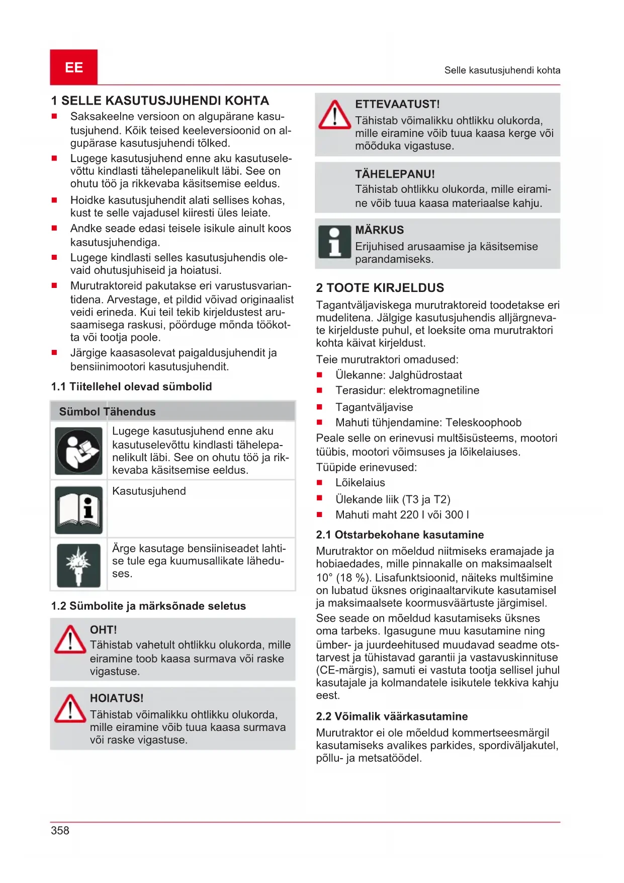 OHT! Tähistab vahetult ohtlikku olukorda, mille eiramine toob kaasa surmava või raske vigastuse. HOIATUS! Tähistab võimalikku ohtlikku olukorda, mille eiramine võib tuua kaasa surmava või raske vigastuse. ETTEVAATUST! Tähistab võimalikku ohtlikku olukorda, mille eiramine võib tuua kaasa kerge või mõõduka vigastuse. TÄHELEPANU! Tähistab ohtlikku olukorda, mille eirami- ne võib tuua kaasa materiaalse kahju. MÄRKUS Erijuhised arusaamise ja käsitsemise parandamiseks. 2 TOOTE KIRJELDUS Tagantväljaviskega murutraktoreid toodetakse eri mudelitena. Jälgige kasutusjuhendis alljärgneva- te kirjelduste puhul, et loeksite oma murutraktori kohta käivat kirjeldust. Teie murutraktori omadused: