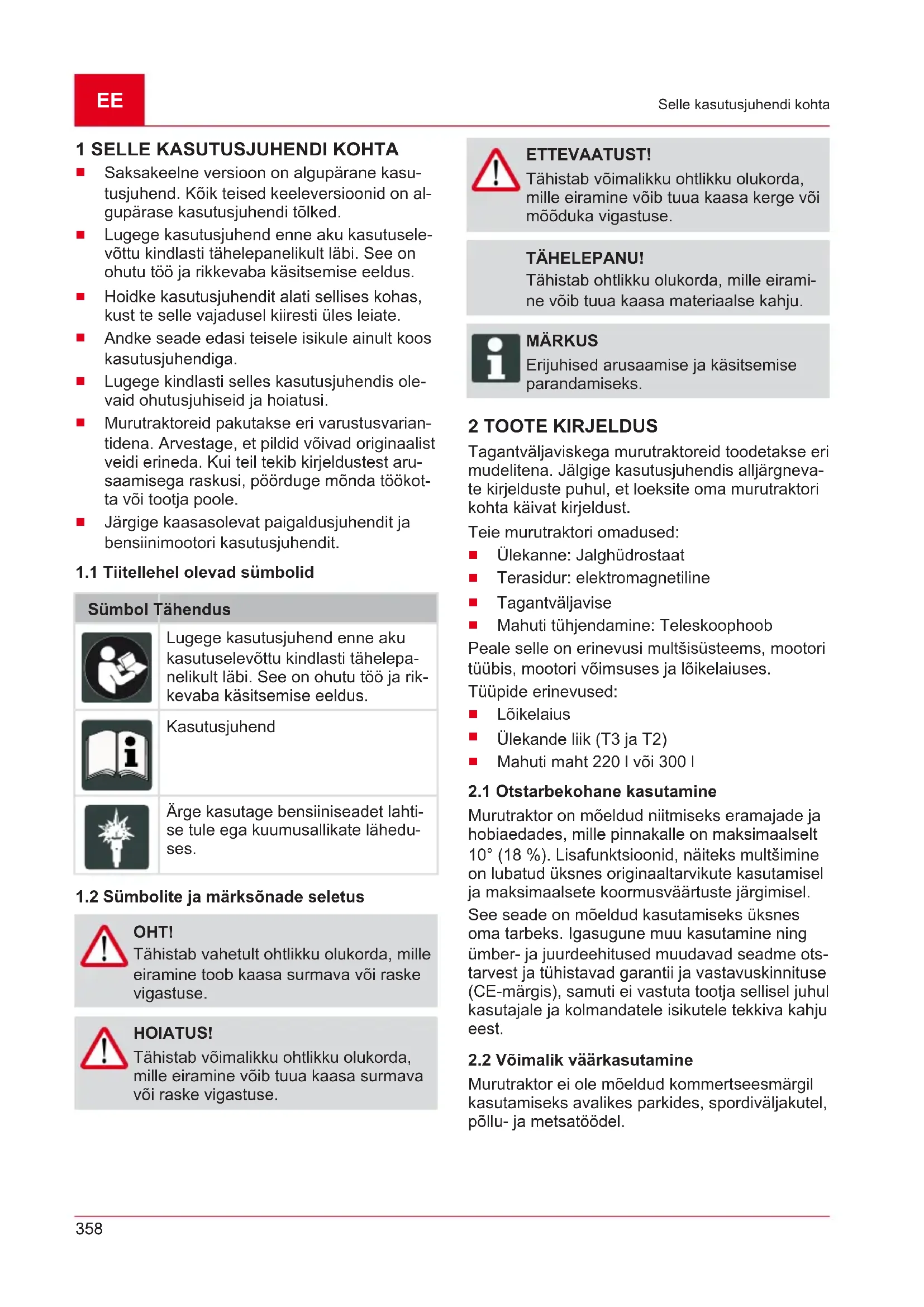 OHT! Tähistab vahetult ohtlikku olukorda, mille eiramine toob kaasa surmava või raske vigastuse. HOIATUS! Tähistab võimalikku ohtlikku olukorda, mille eiramine võib tuua kaasa surmava või raske vigastuse. ETTEVAATUST! Tähistab võimalikku ohtlikku olukorda, mille eiramine võib tuua kaasa kerge või mõõduka vigastuse. TÄHELEPANU! Tähistab ohtlikku olukorda, mille eirami- ne võib tuua kaasa materiaalse kahju. MÄRKUS Erijuhised arusaamise ja käsitsemise parandamiseks. 2 TOOTE KIRJELDUS Tagantväljaviskega murutraktoreid toodetakse eri mudelitena. Jälgige kasutusjuhendis alljärgneva- te kirjelduste puhul, et loeksite oma murutraktori kohta käivat kirjeldust. Teie murutraktori omadused: