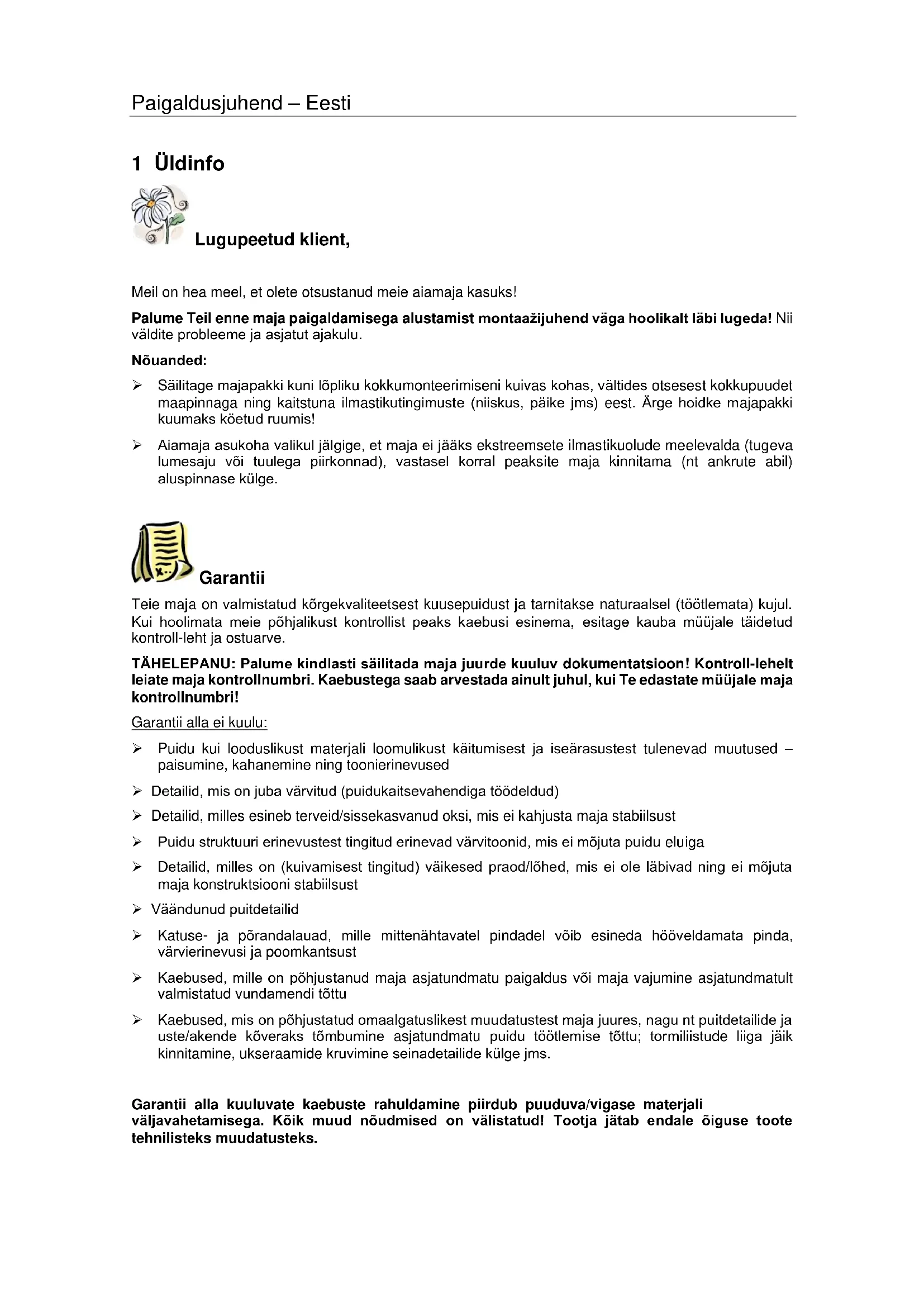 1 Üldinfo Lugupeetud klient, Meil on hea meel, et olete otsustanud meie aiamaja kasuks! Palume Teil enne maja paigaldamisega alustamist montaažijuhend väga hoolikalt läbi lugeda! Nii väldite probleeme ja asjatut ajakulu. Nõuanded: ➢ Säilitage majapakki kuni lõpliku kokkumonteerimiseni kuivas kohas, vältides otsesest kokkupuudet maapinnaga ning kaitstuna ilmastikutingimuste (niiskus, päike jms) eest. Ärge hoidke majapakki kuumaks köetud ruumis! ➢ Aiamaja asukoha valikul jälgige, et maja ei jääks ekstreemsete ilmastikuolude meelevalda (tugeva lumesaju või tuulega piirkonnad), vastasel korral peaksite maja kinnitama (nt ankrute abil) aluspinnase külge. Garantii Teie maja on valmistatud kõrgekvaliteetsest kuusepuidust ja tarnitakse naturaalsel (töötlemata) kujul. Kui hoolimata meie põhjalikust kontrollist peaks kaebusi esinema, esitage kauba müüjale täidetud kontroll-leht ja ostuarve. TÄHELEPANU: Palume kindlasti säilitada maja juurde kuuluv dokumentatsioon! Kontroll-lehelt leiate maja kontrollnumbri. Kaebustega saab arvestada ainult juhul, kui Te edastate müüjale maja kontrollnumbri! Garantii alla ei kuulu: ➢ Puidu kui looduslikust materjali loomulikust käitumisest ja iseärasustest tulenevad muutused – paisumine, kahanemine ning toonierinevused ➢ Detailid, mis on juba värvitud (puidukaitsevahendiga töödeldud) ➢ Detailid, milles esineb terveid/sissekasvanud oksi, mis ei kahjusta maja stabiilsust ➢ Puidu struktuuri erinevustest tingitud erinevad värvitoonid, mis ei mõjuta puidu eluiga ➢ Detailid, milles on (kuivamisest tingitud) väikesed praod/lõhed, mis ei ole läbivad ning ei mõjuta maja konstruktsiooni stabiilsust ➢ Väändunud puitdetailid ➢ Katuse- ja põrandalauad, mille mittenähtavatel pindadel võib esineda hööveldamata pinda, värvierinevusi ja poomkantsust ➢ Kaebused, mille on põhjustanud maja asjatundmatu paigaldus või maja vajumine asjatundmatult valmistatud vundamendi tõttu ➢ Kaebused, mis on põhjustatud omaalgatuslikest muudatustest maja juures, nagu nt puitdetailide ja uste/akende kõveraks tõmbumine asjatundmatu puidu töötlemise tõttu; tormiliistude liiga jäik kinnitamine, ukseraamide kruvimine seinadetailide külge jms. Garantii alla kuuluvate kaebuste rahuldamine piirdub puuduva/vigase materjali väljavahetamisega. Kõik muud nõudmised on välistatud! Tootja jätab endale õiguse toote tehnilisteks muudatusteks.Paigaldusjuhend – Eesti