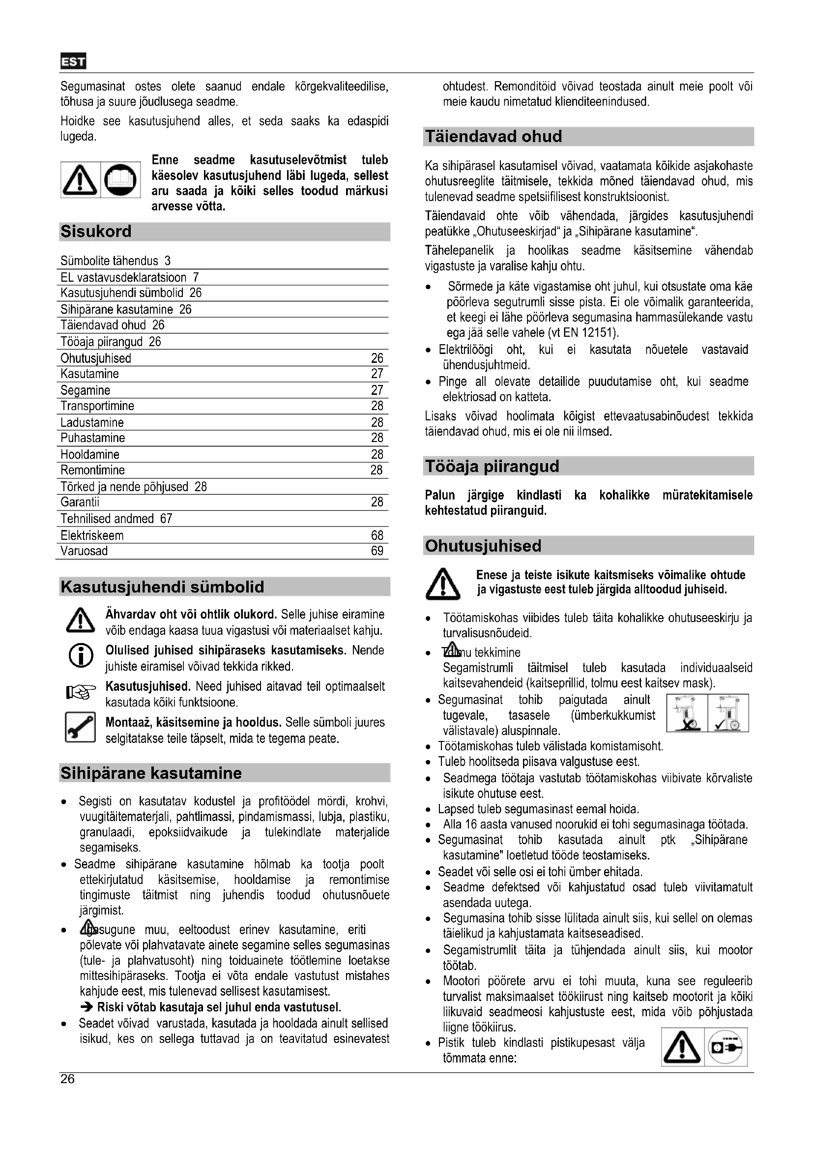 Sihipärane kasutamine Segisti on kasutatav kodustel ja profitöödel mördi, krohvi, vuugitäitematerjali, pahtlimassi, pindamismassi, lubja, plastiku, granulaadi, epoksiidvaikude ja tulekindlate materjalide segamiseks. Seadme sihipärane kasutamine hõlmab ka tootja poolt ettekirjutatud käsitsemise, hooldamise ja remontimise tingimuste täitmist ning juhendis toodud ohutusnõuete järgimist. Igasugune muu, eeltoodust erinev kasutamine, eriti põlevate või plahvatavate ainete segamine selles segumasinas (tule- ja plahvatusoht) ning toiduainete töötlemine loetakse mittesihipäraseks. Tootja ei võta endale vastutust mistahes kahjude eest, mis tulenevad sellisest kasutamisest. Riski võtab kasutaja sel juhul enda vastutusel. Seadet võivad varustada, kasutada ja hooldada ainult sellised isikud, kes on sellega tuttavad ja on teavitatud esinevatest ohtudest. Remonditöid võivad teostada ainult meie poolt või meie kaudu nimetatud klienditeenindused.